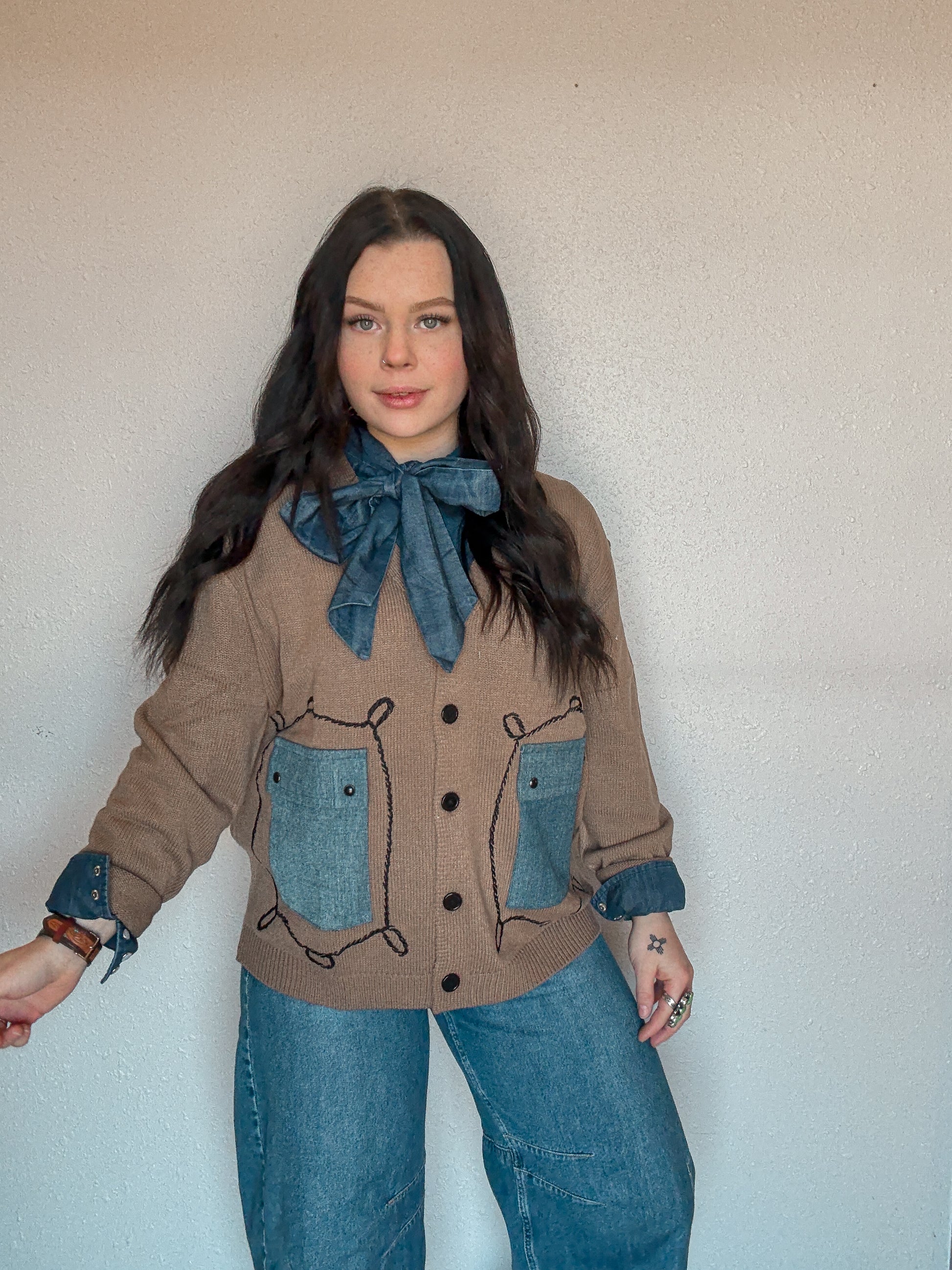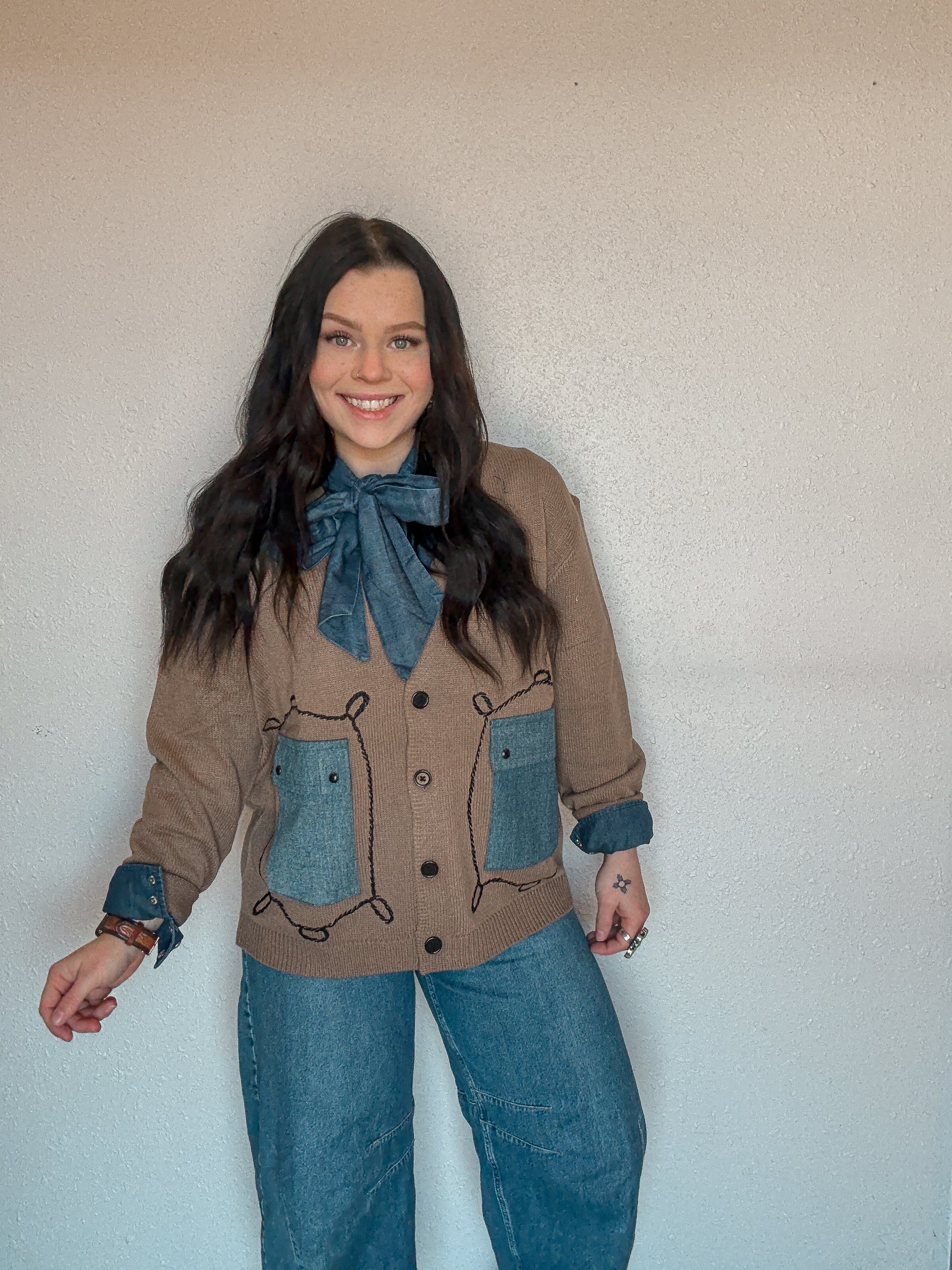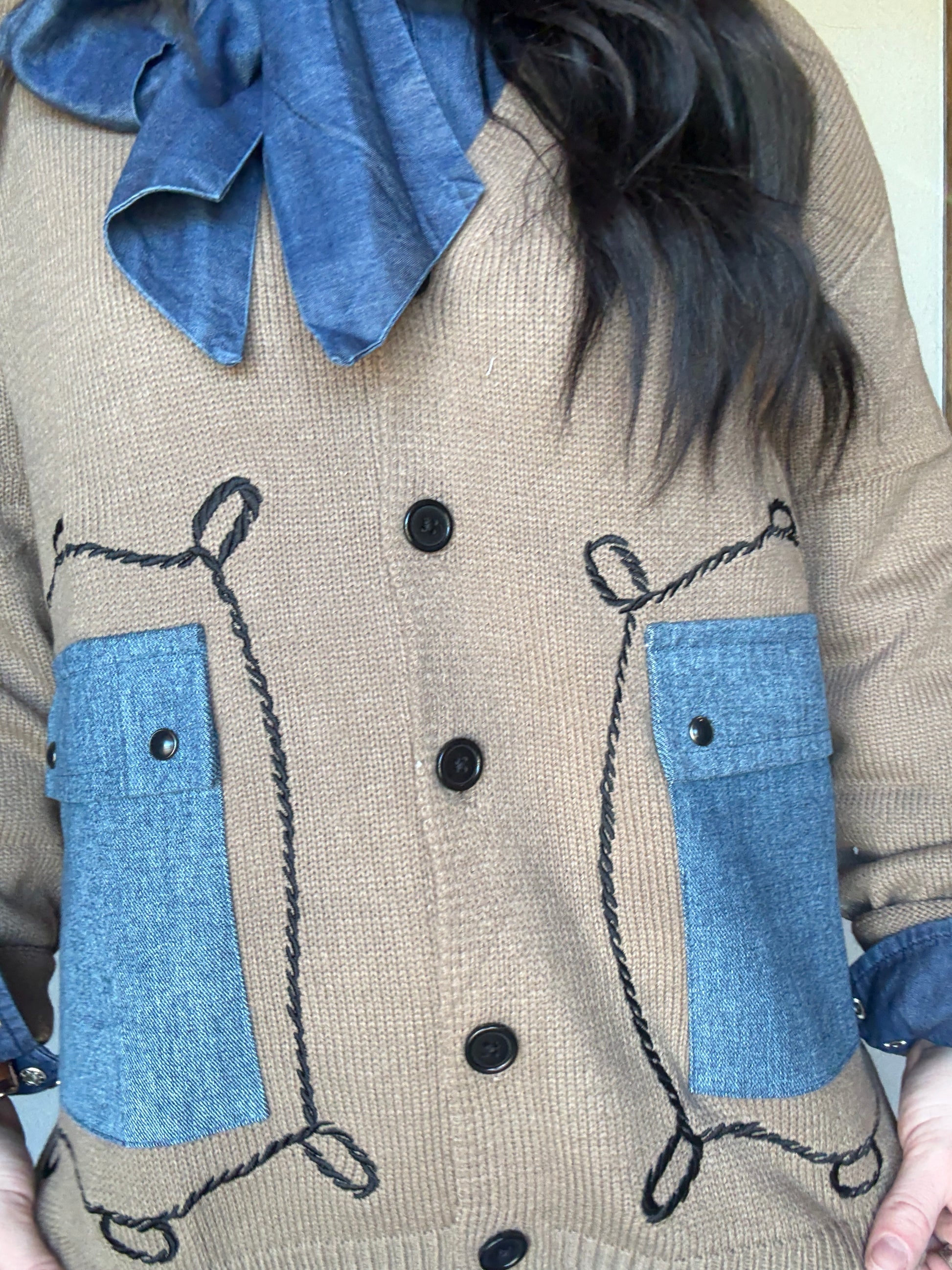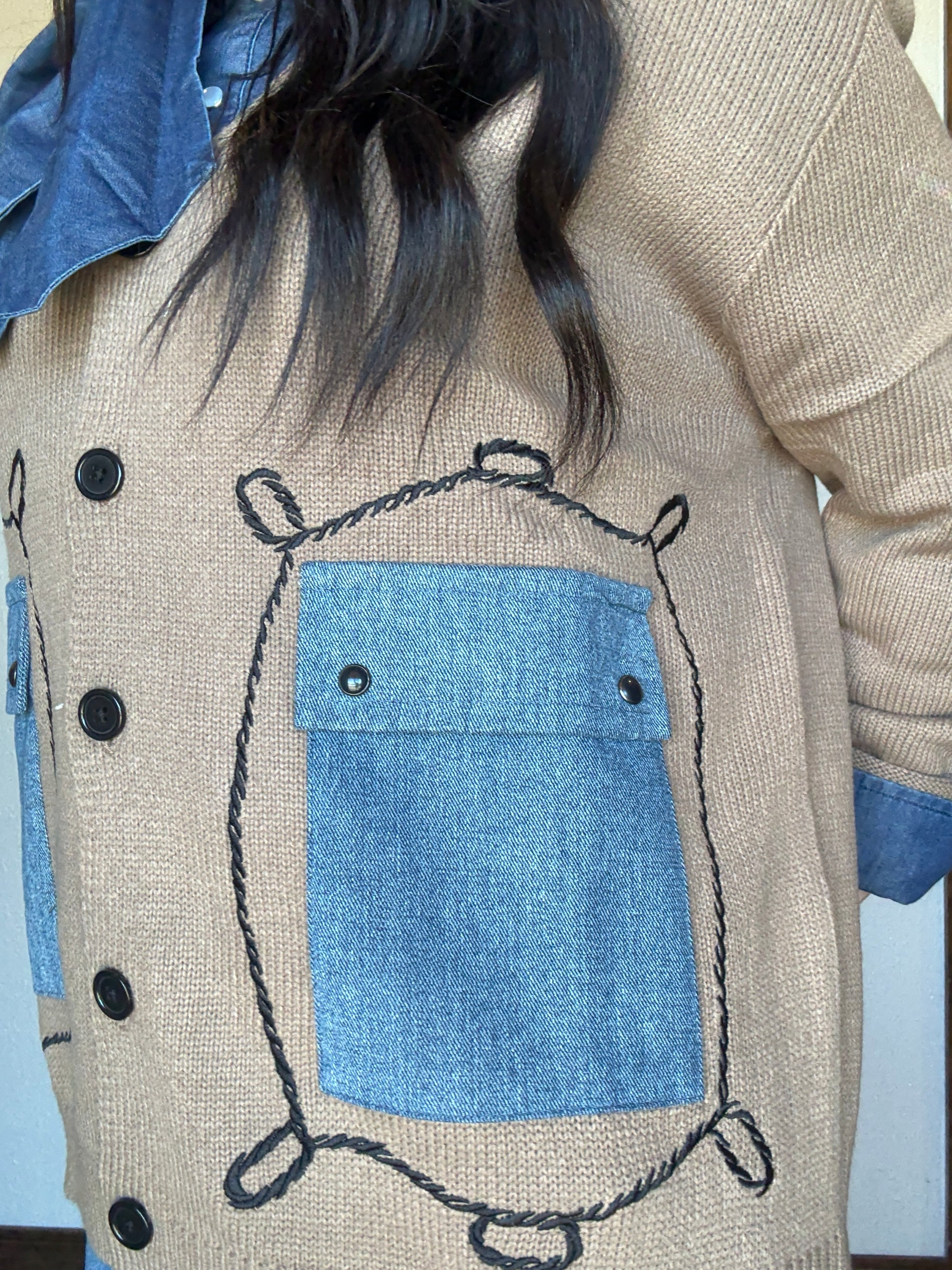 cardigan fit with denim pockets and rope embroidery. This cardigan would make a GREAT transition piece for spring. you could pair it with some shorts, a basic top, and some sneakers.