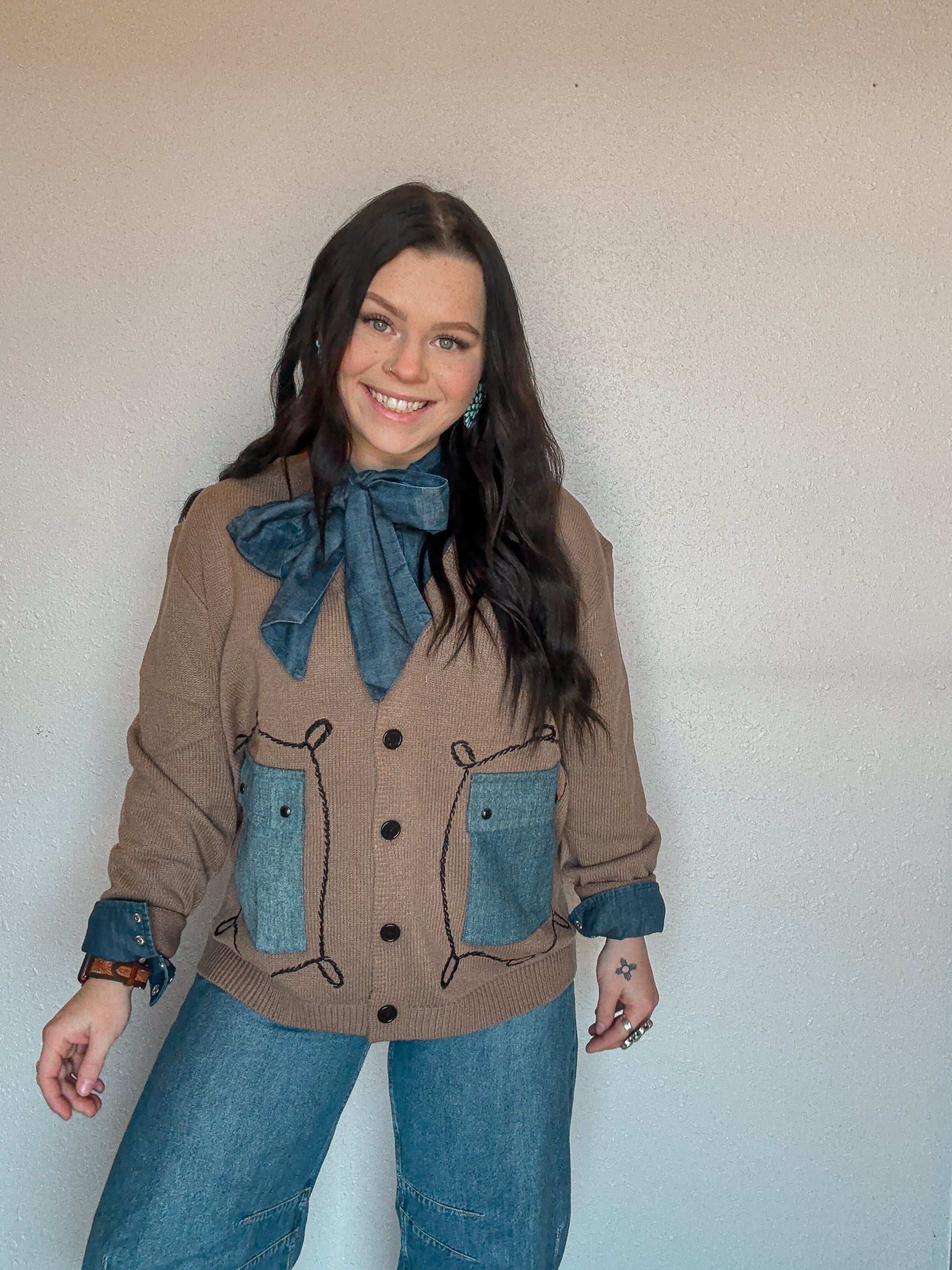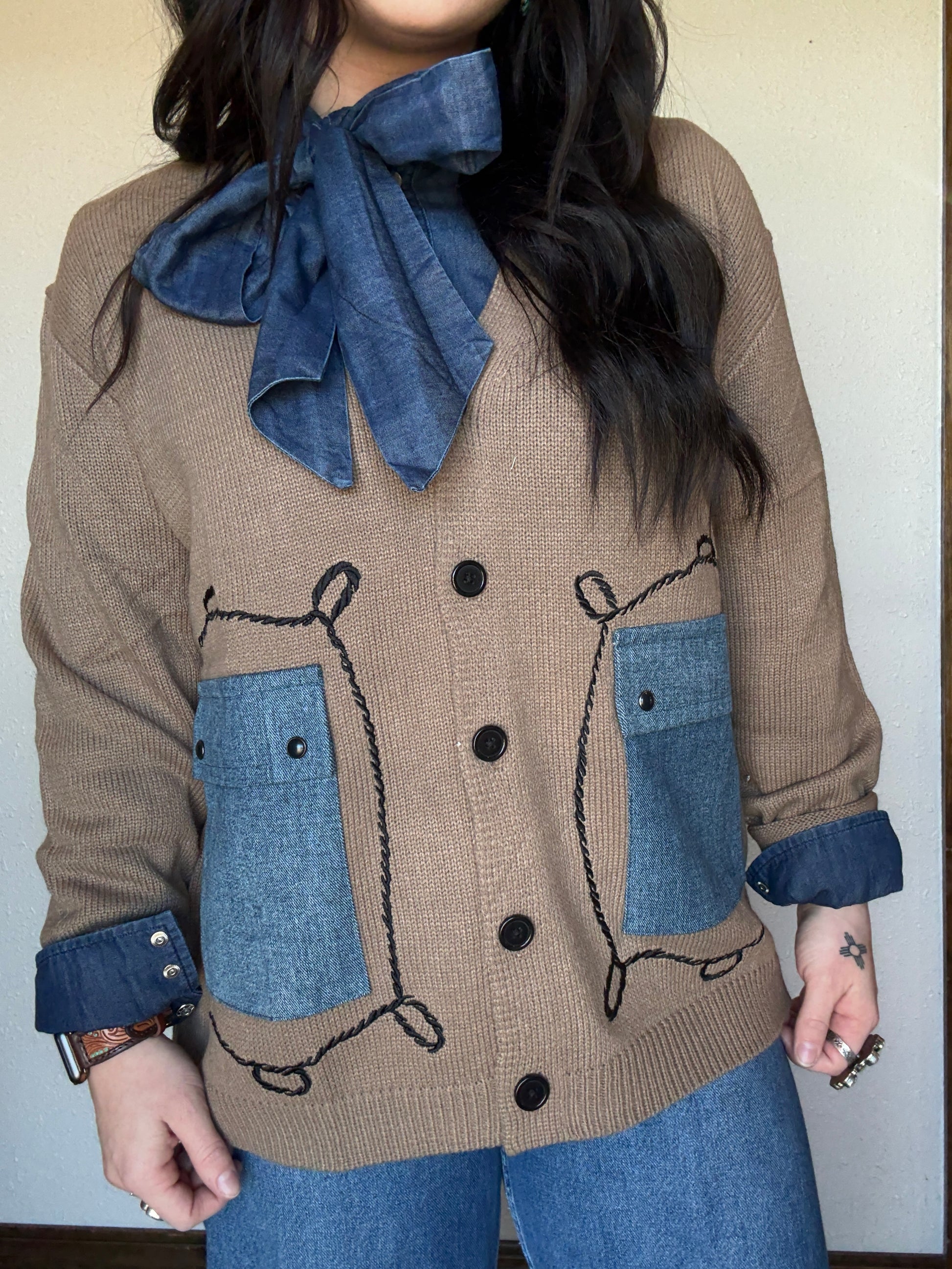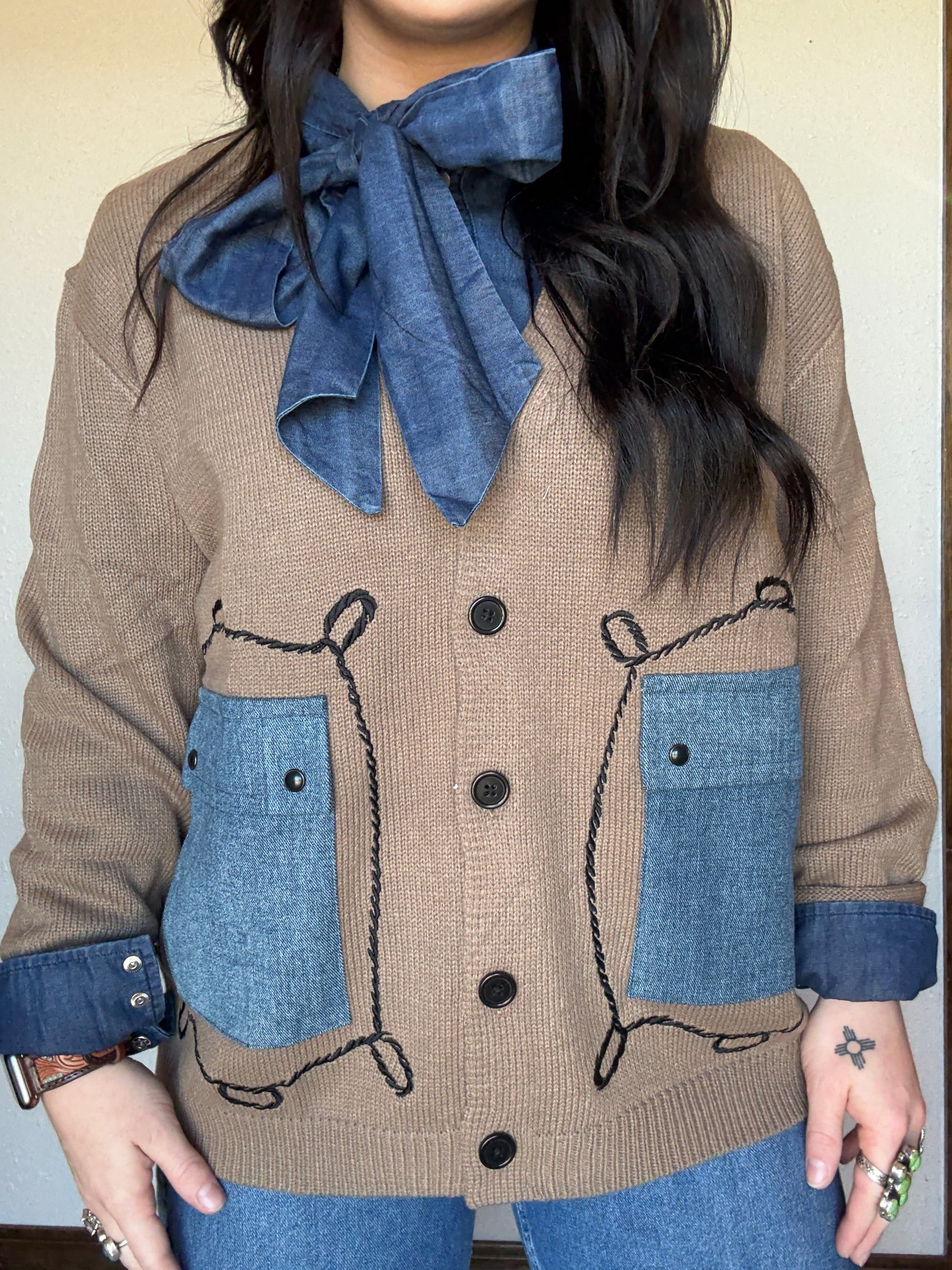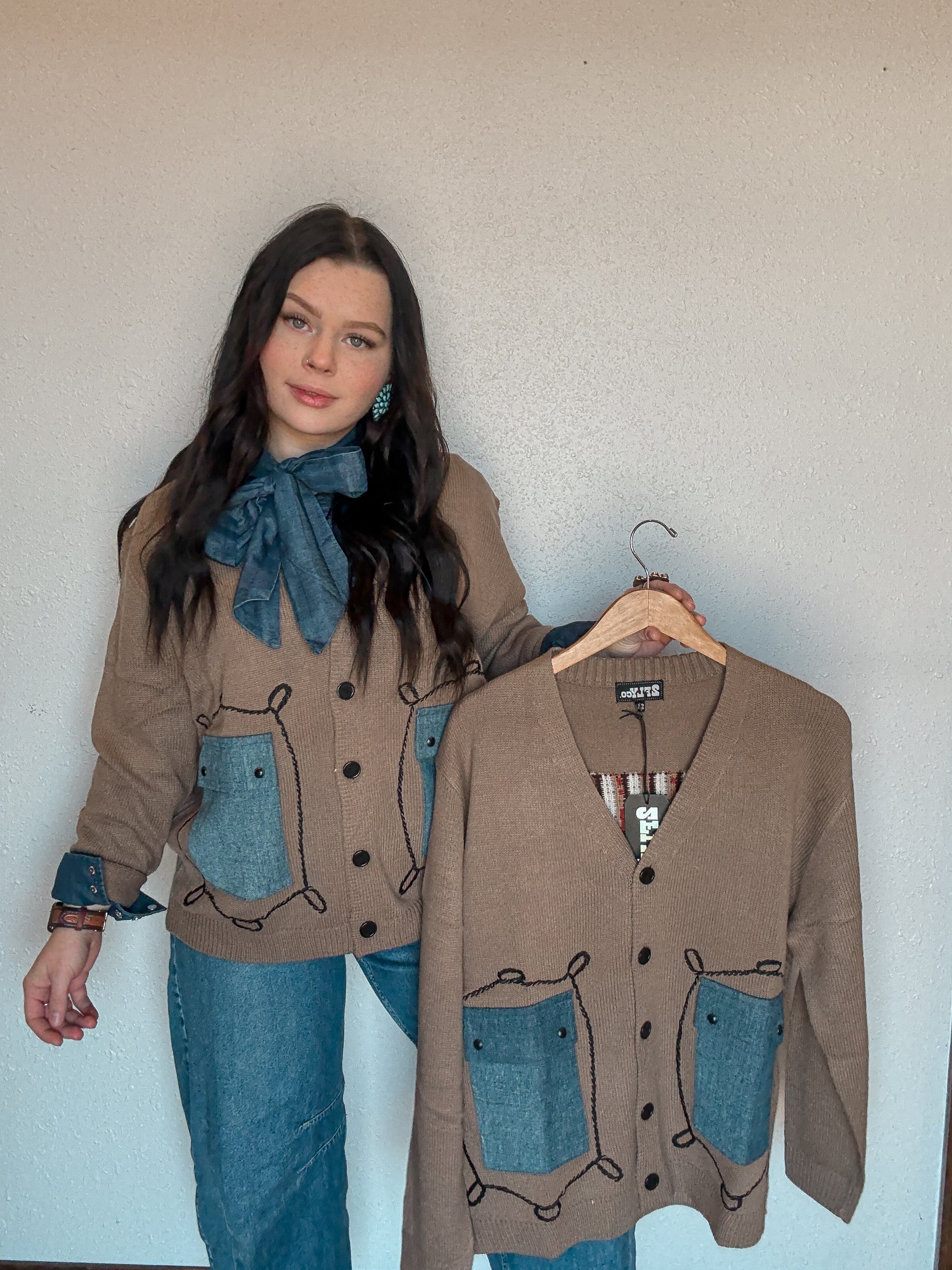 cardigan fit with denim pockets and rope embroidery. This cardigan would make a GREAT transition piece for spring. you could pair it with some shorts, a basic top, and some sneakers.
