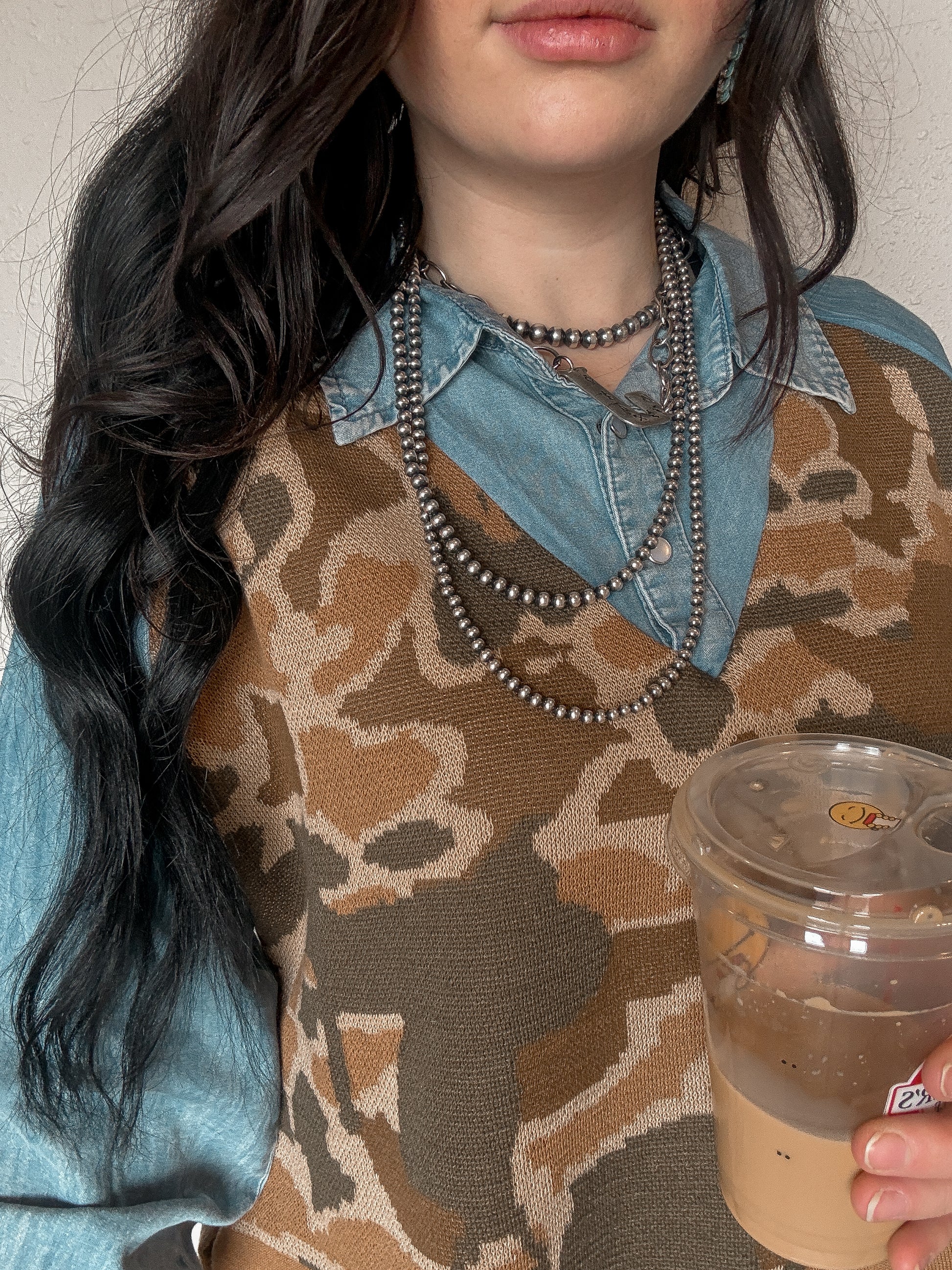 this top is giving that layering effect that we are OBSESSED with. it's a denim chambray with a camp knit body.