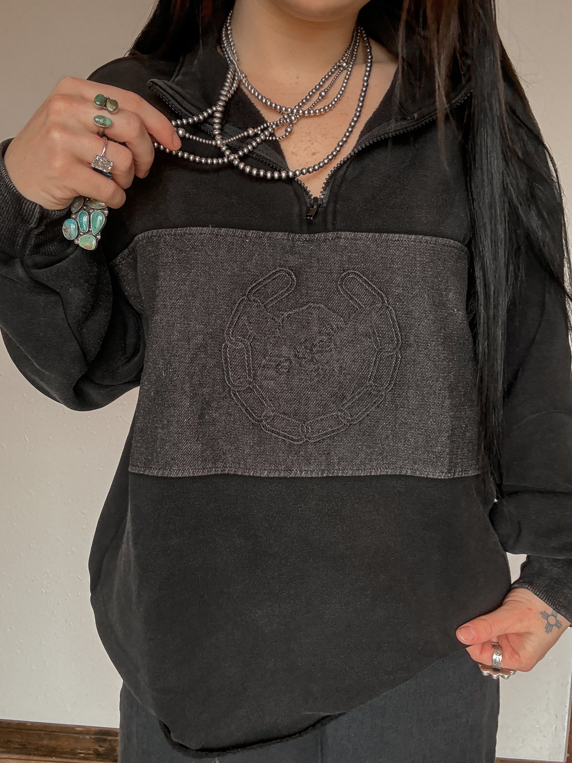 this pullover is a NECESSITY. we used our SUPER DUPER soft sweatshirt material... like seriously it's the SOFTEST. PLUS the middle is an embossed denim graphic - OBSESSED. style with a button up for a dressier or look!