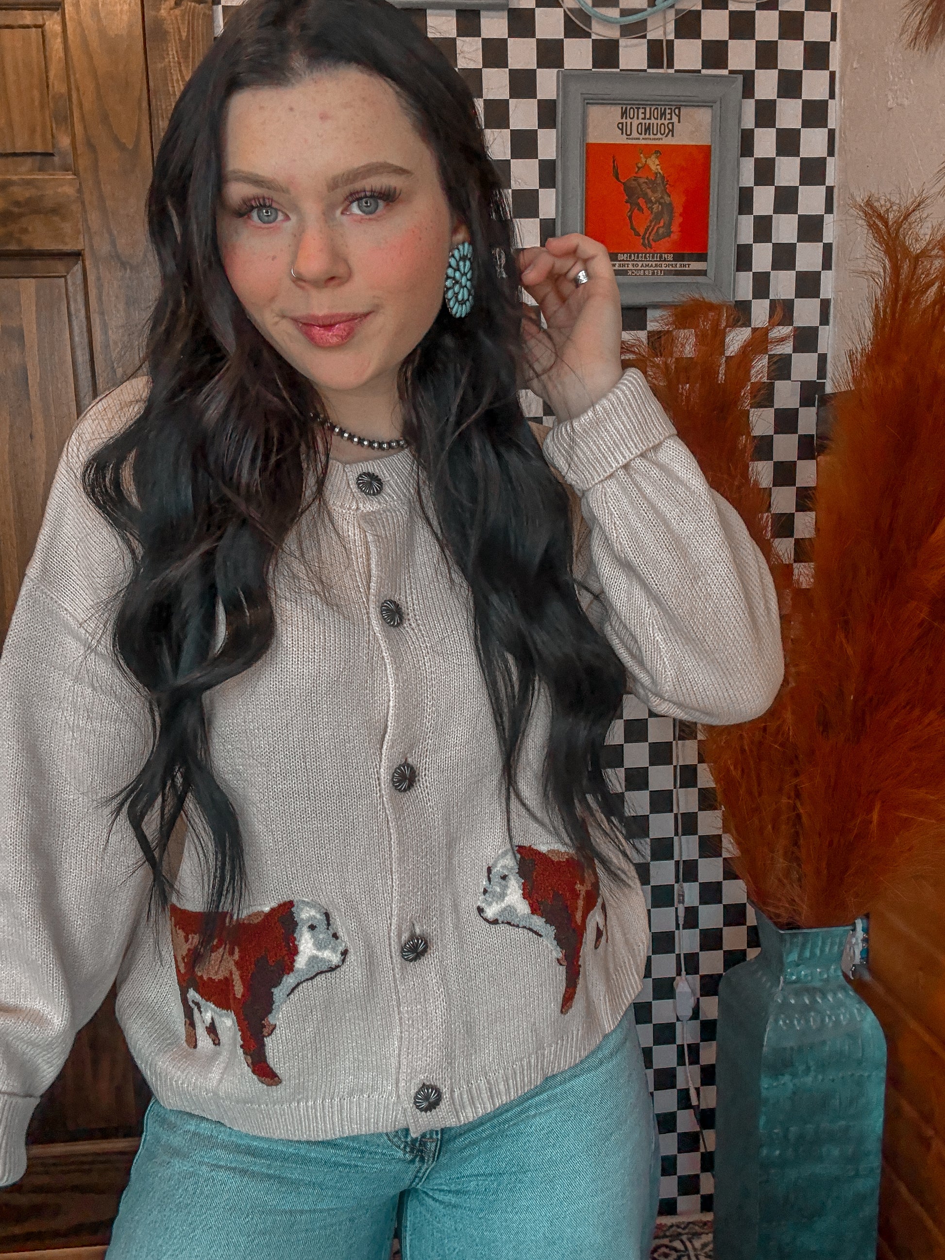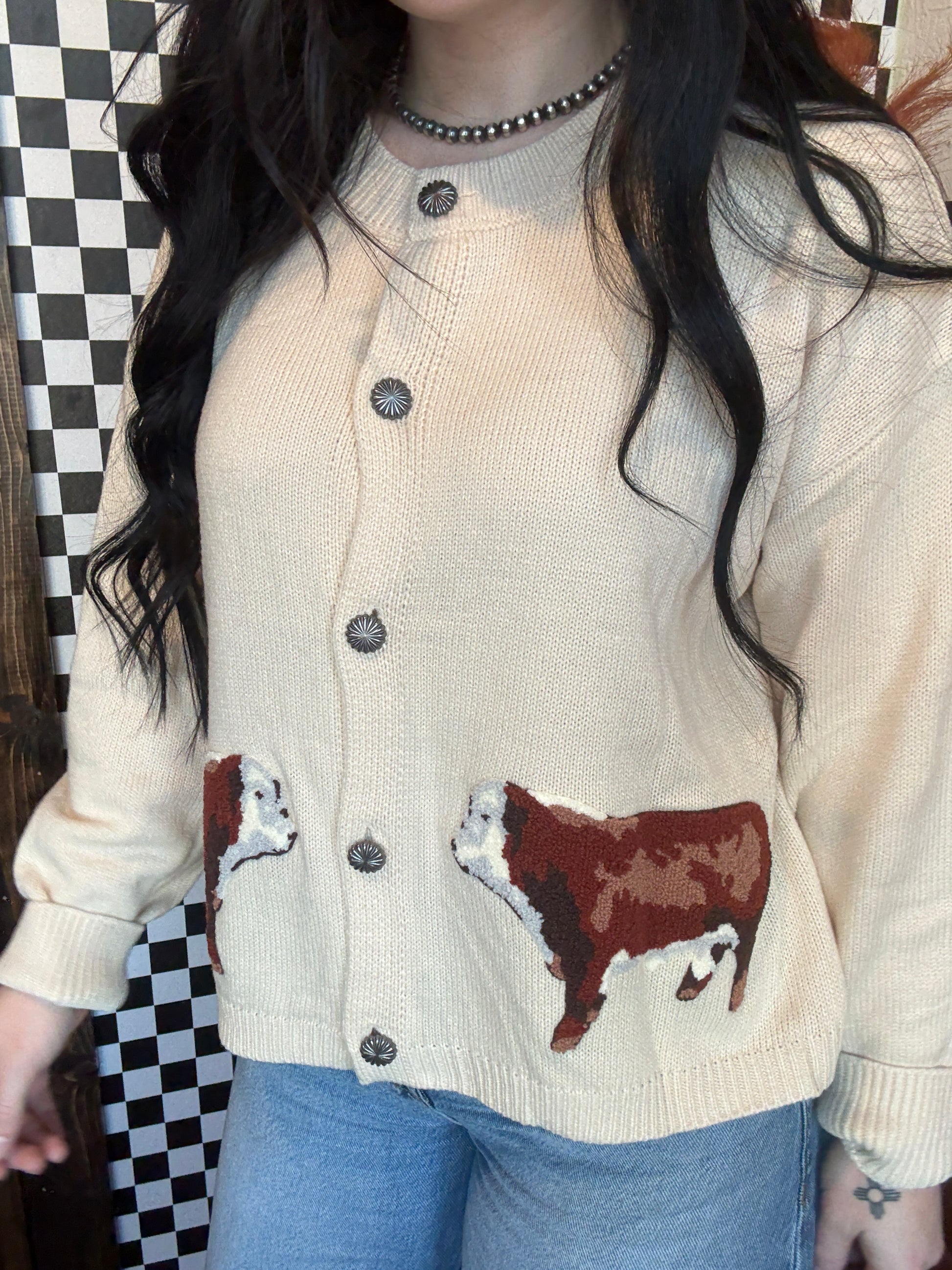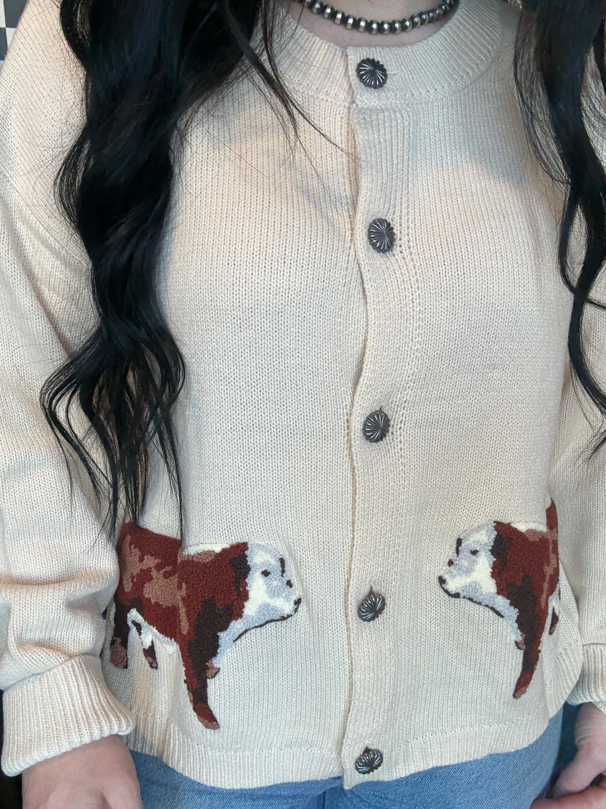 taupe cardigan with some hereford patches... we are in LOVEEE.