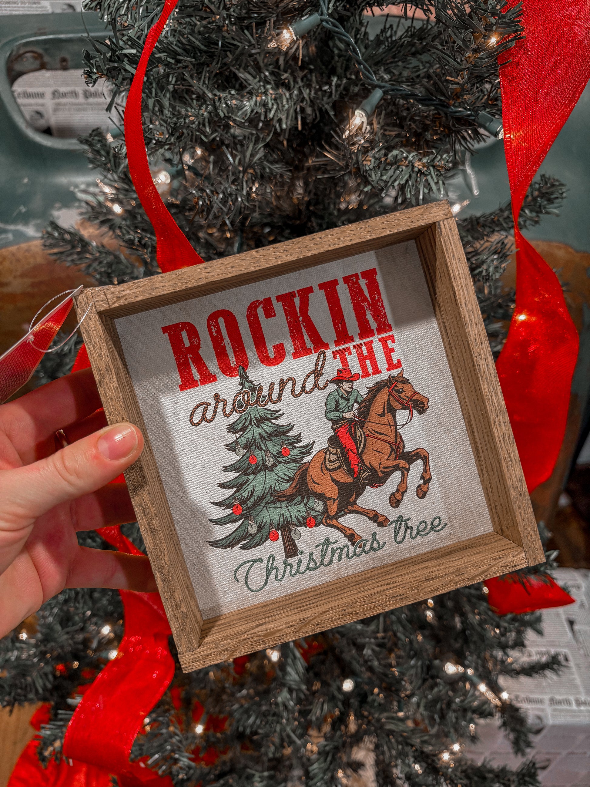 Capture the spirit of the season with our vintage-inspired art print. Featuring a cowboy confidently riding a horse against the backdrop of a decorated Christmas tree. The scene exudes a unique Western charm, with a nod to classic holiday festivities. Hang this artwork in your living room to infuse your home with the spirit of Christmas with a vintage Western vibe.
