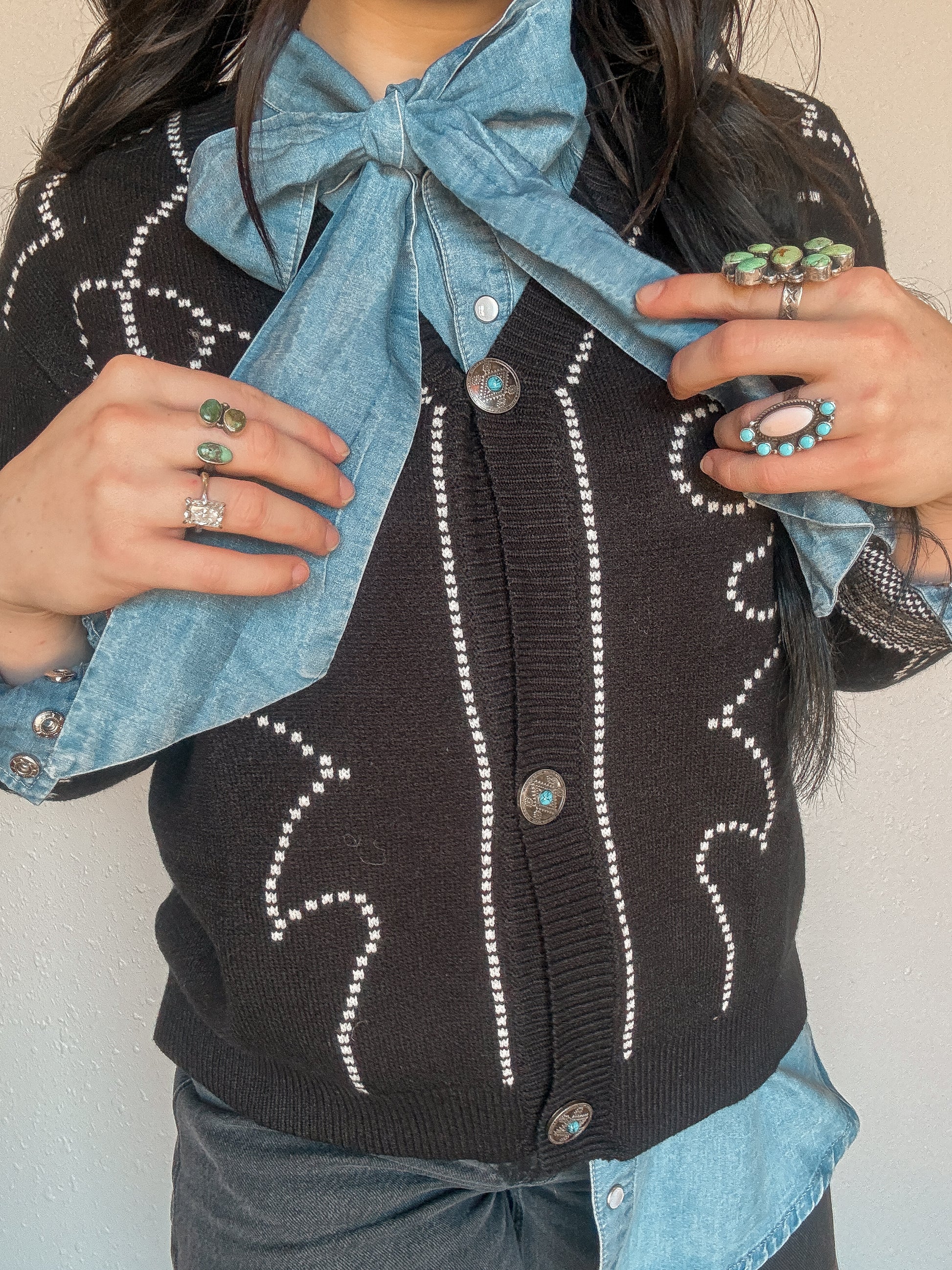 black western knit cardigan designed for bold, fashion-forward cowgirls. This cozy yet statement-making piece features a striking saddle motif on the back created entirely from glimmering silver rhinestones, adding a dazzling Western flair from every angle. The front is adorned with intricate rhinestone scrollwork that traces down the sleeves and chest, offering a head-turning sparkle under any lighting. Constructed from a soft, midweight knit fabric, this cardigan is the perfect balance of comfort and sass—ideal for chilly rodeo nights, market runs, or everyday boutique styling. Functional front buttons with turquoise accents complete the look, while ribbed cuffs and hem provide a polished, flattering fit. Whether paired with jeans and a belt for a casual Western vibe or layered over a dress for a chic ranch-chic ensemble