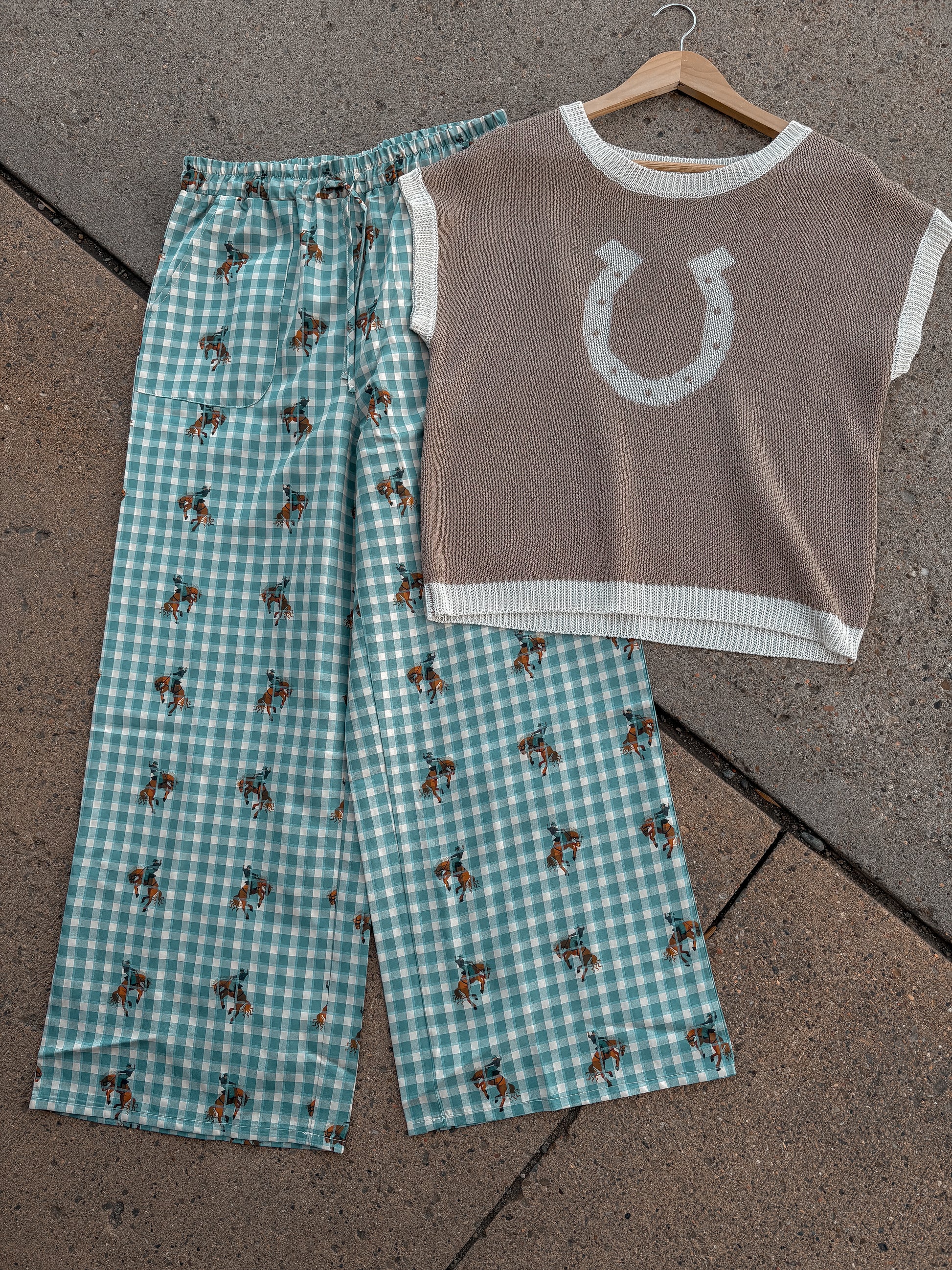 Statement wide-leg pants featuring a light blue and white gingham pattern with an all-over novelty cowboy print. Designed with a relaxed fit through the leg and a comfortable high-rise waist. Soft, lightweight woven fabric offers an easy drape, making them suitable for casual or statement styling.