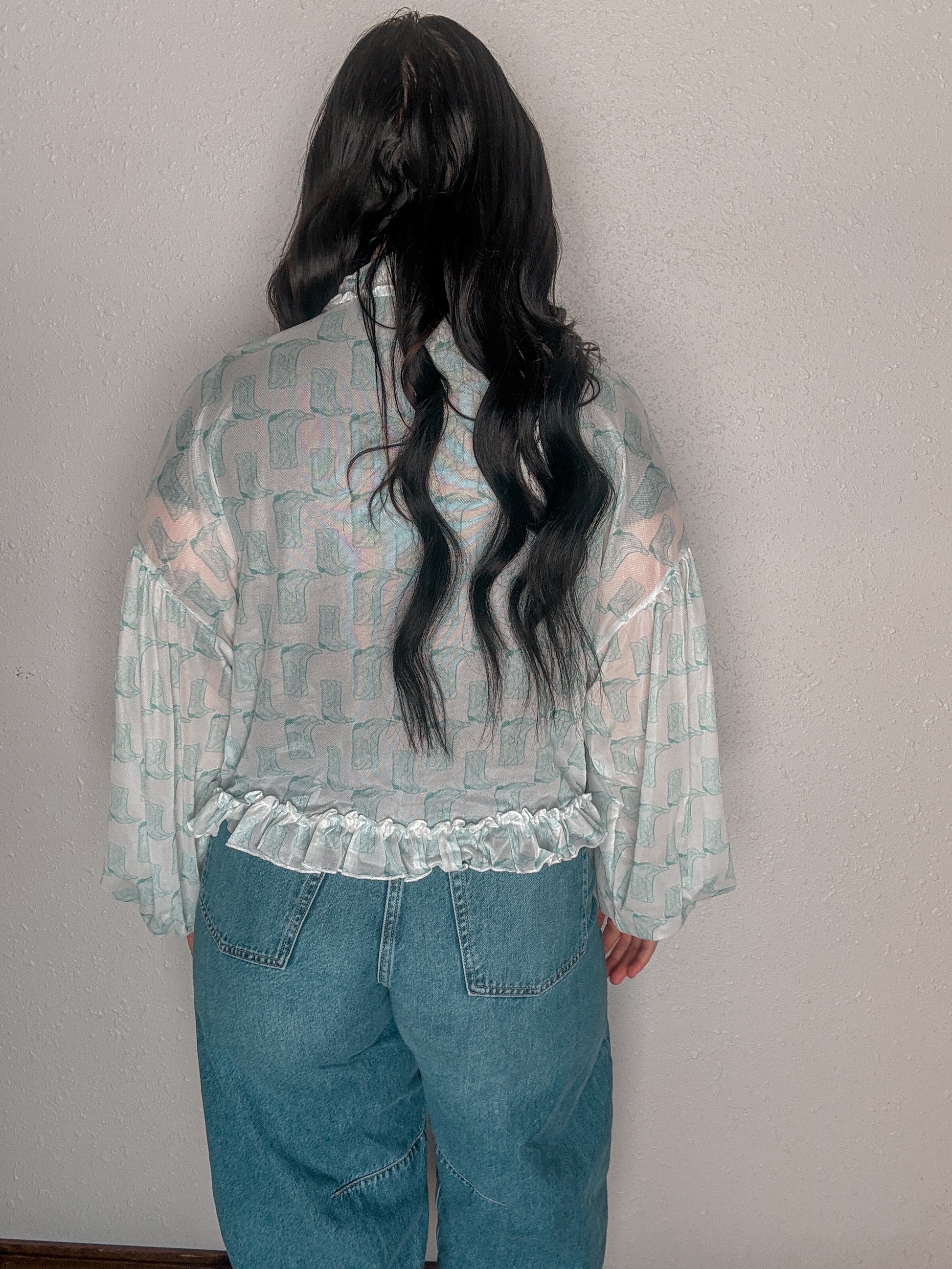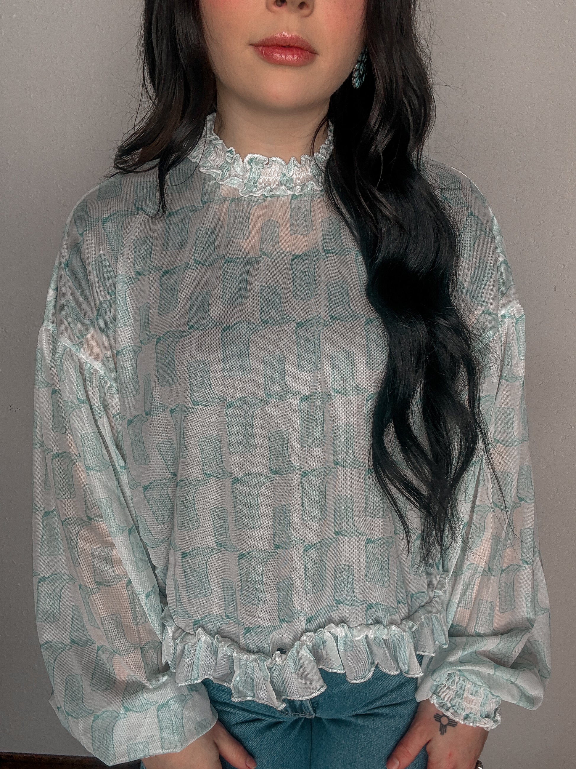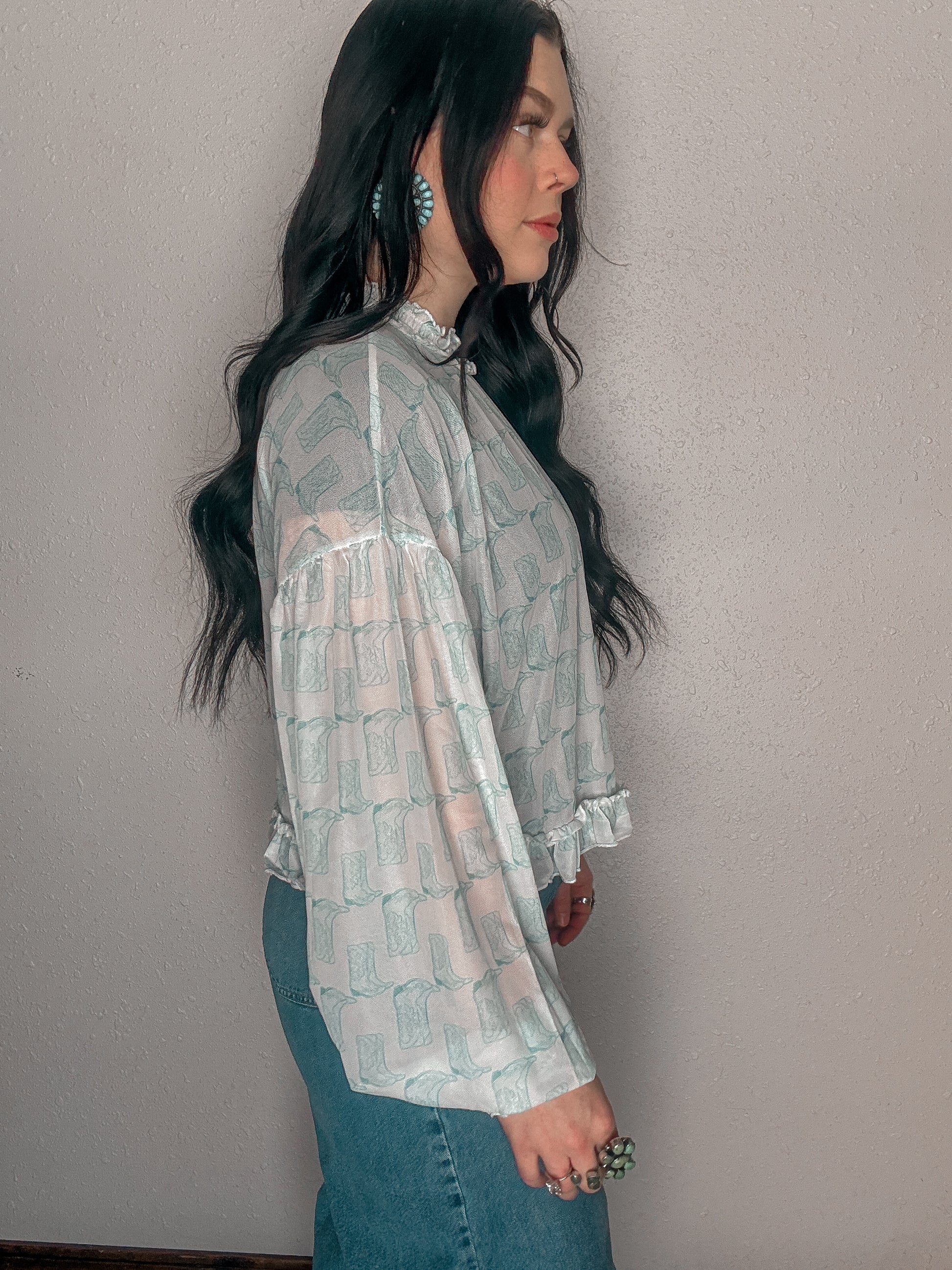 - Sleeves: Long bishop sleeves with elasticized ruffle cuffs