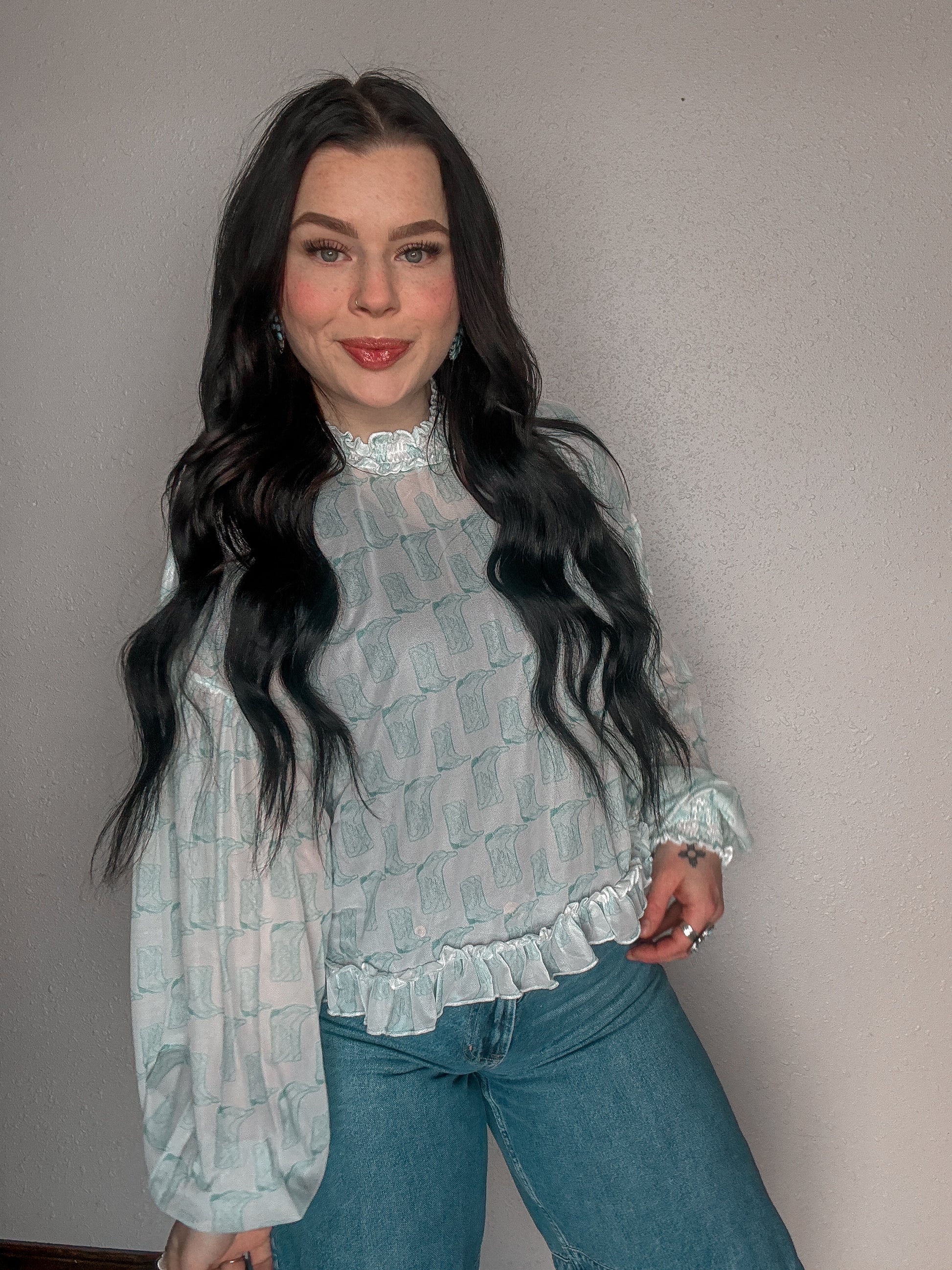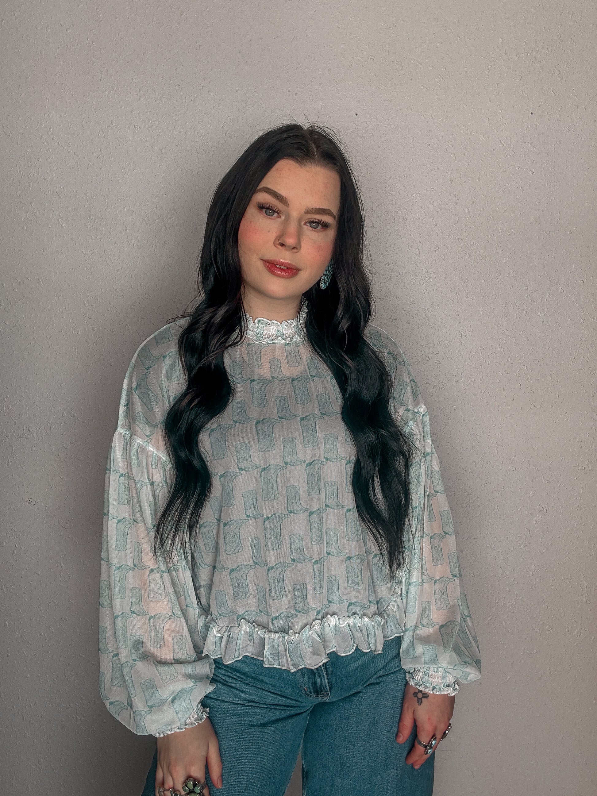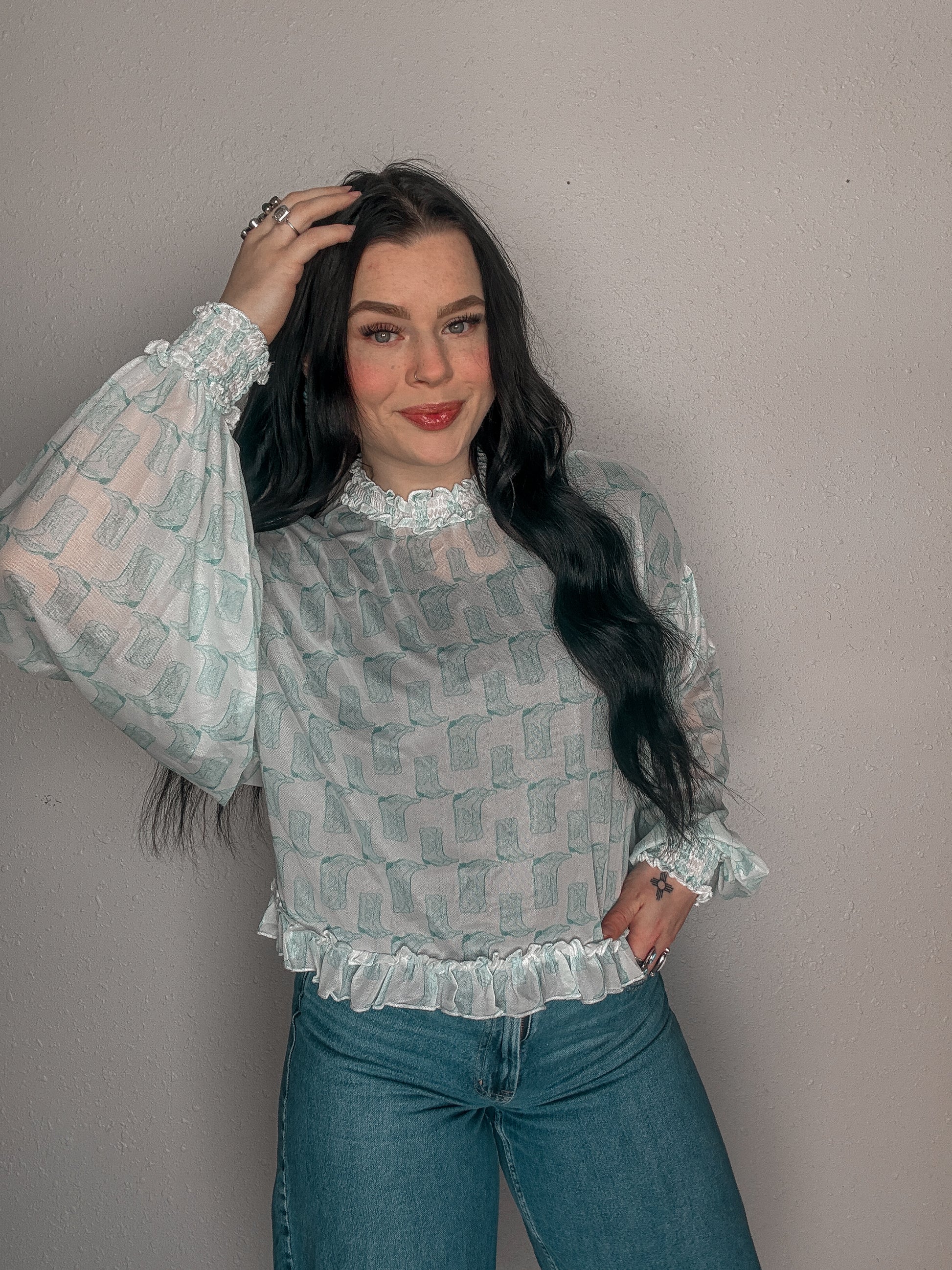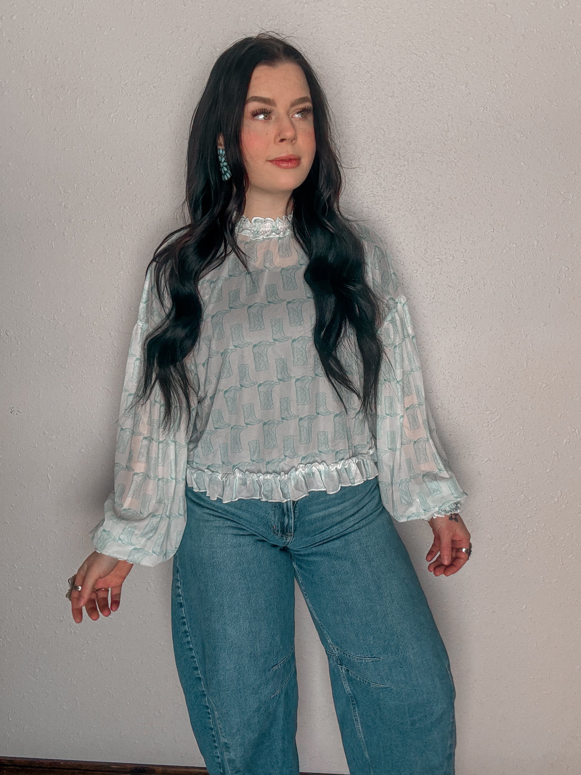 - Sleeves: Long bishop sleeves with elasticized ruffle cuffs