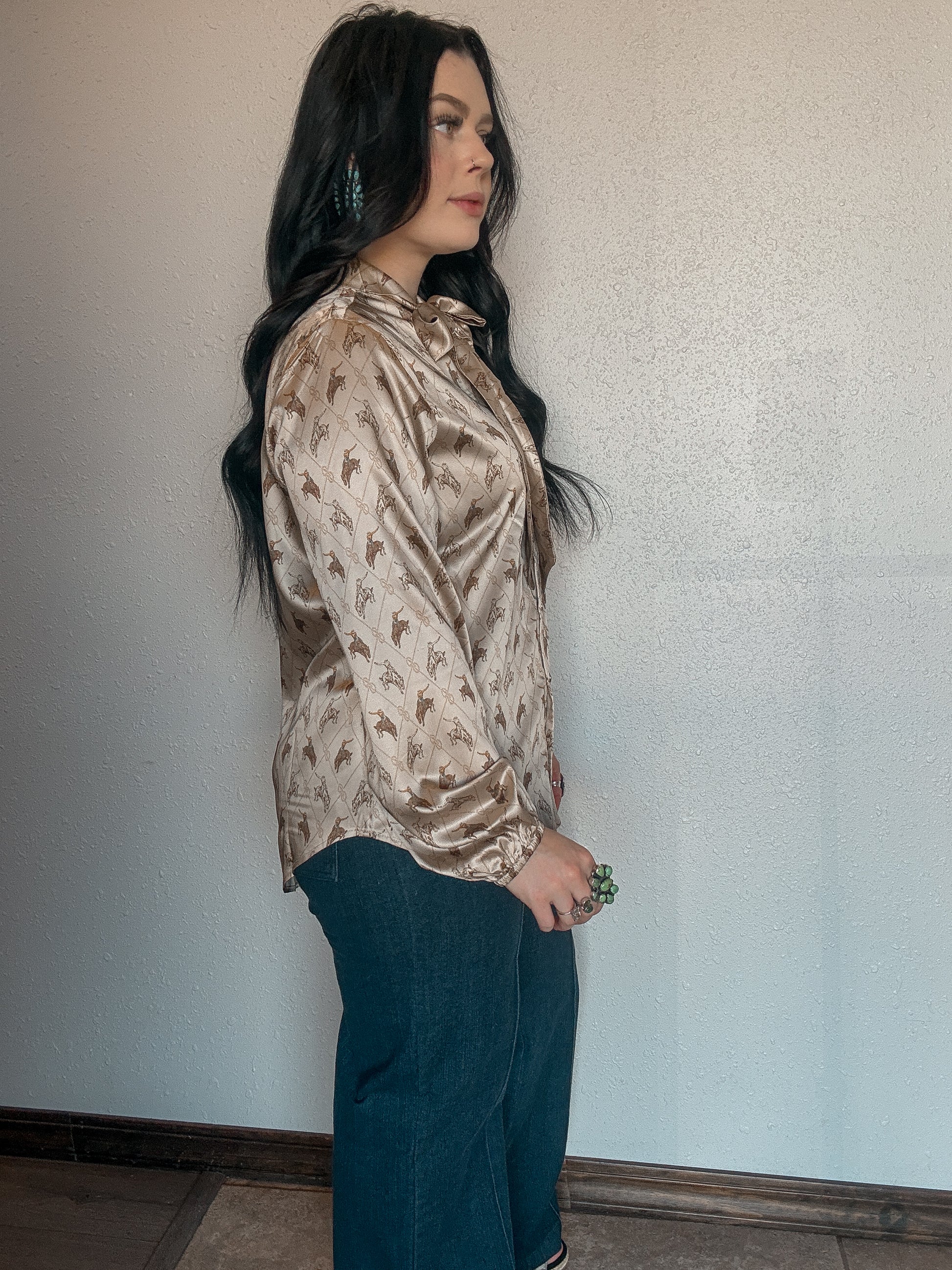 it's got the ties at the top for that upscale blousy look and a satin feel. style with some wide leg crop jeans or some brown leather shorts, and TALL brown boots ... ummmm YESS MA'AM. the cuff on this one isn't like our other tops it's a elastic band cuff -- meant to let the sleeve have a more blousy sleeve vibe.