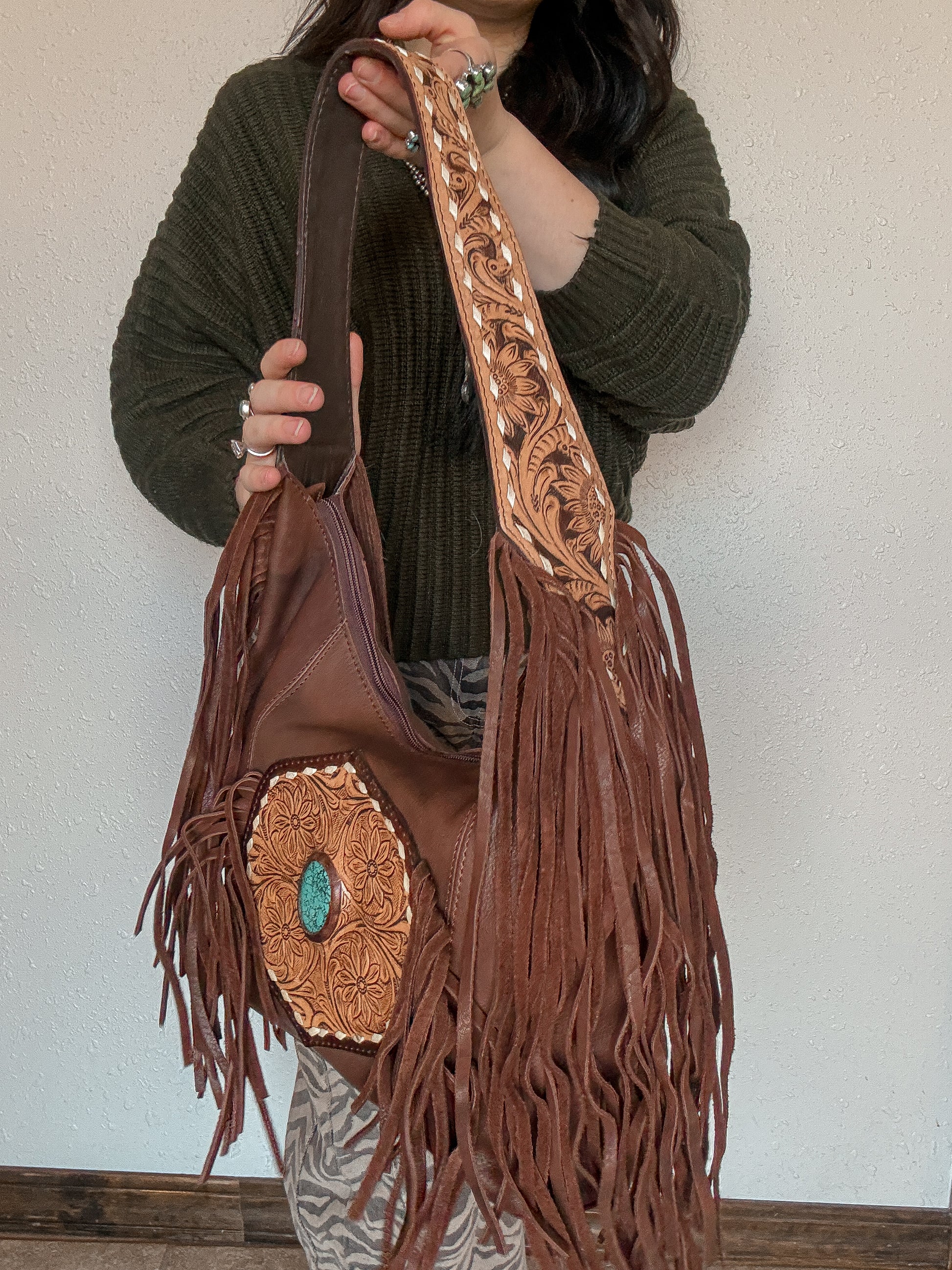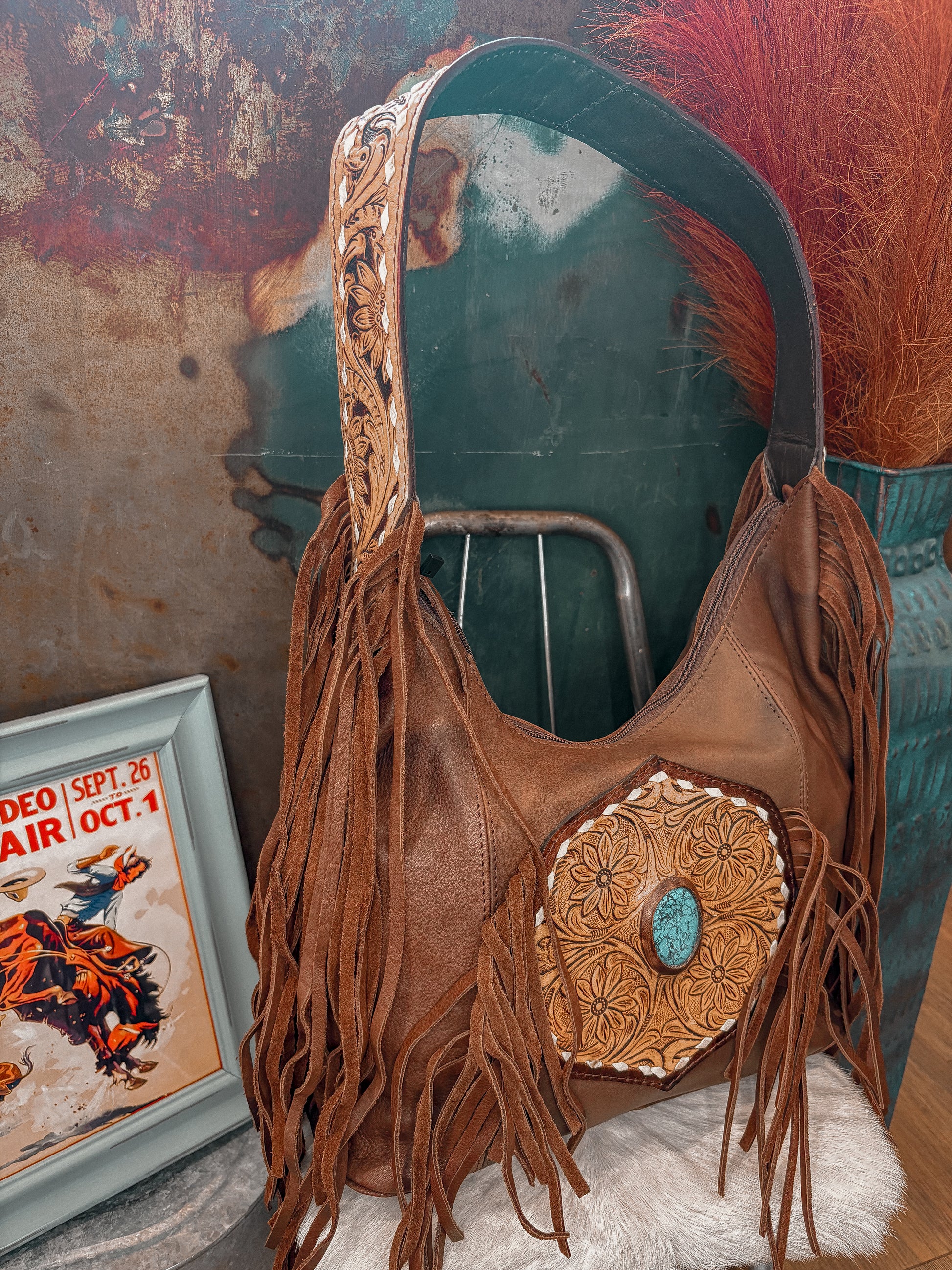 stunning American Darling hobo bag. Crafted from rich full-grain leather, this bag features a hand-tooled circular floral medallion centerpiece with a turquoise stone accent. The shoulder strap is artfully tooled, and side fringe detailing adds movement and character. A standout accessory that blends artisanal craftsmanship with everyday functionality.