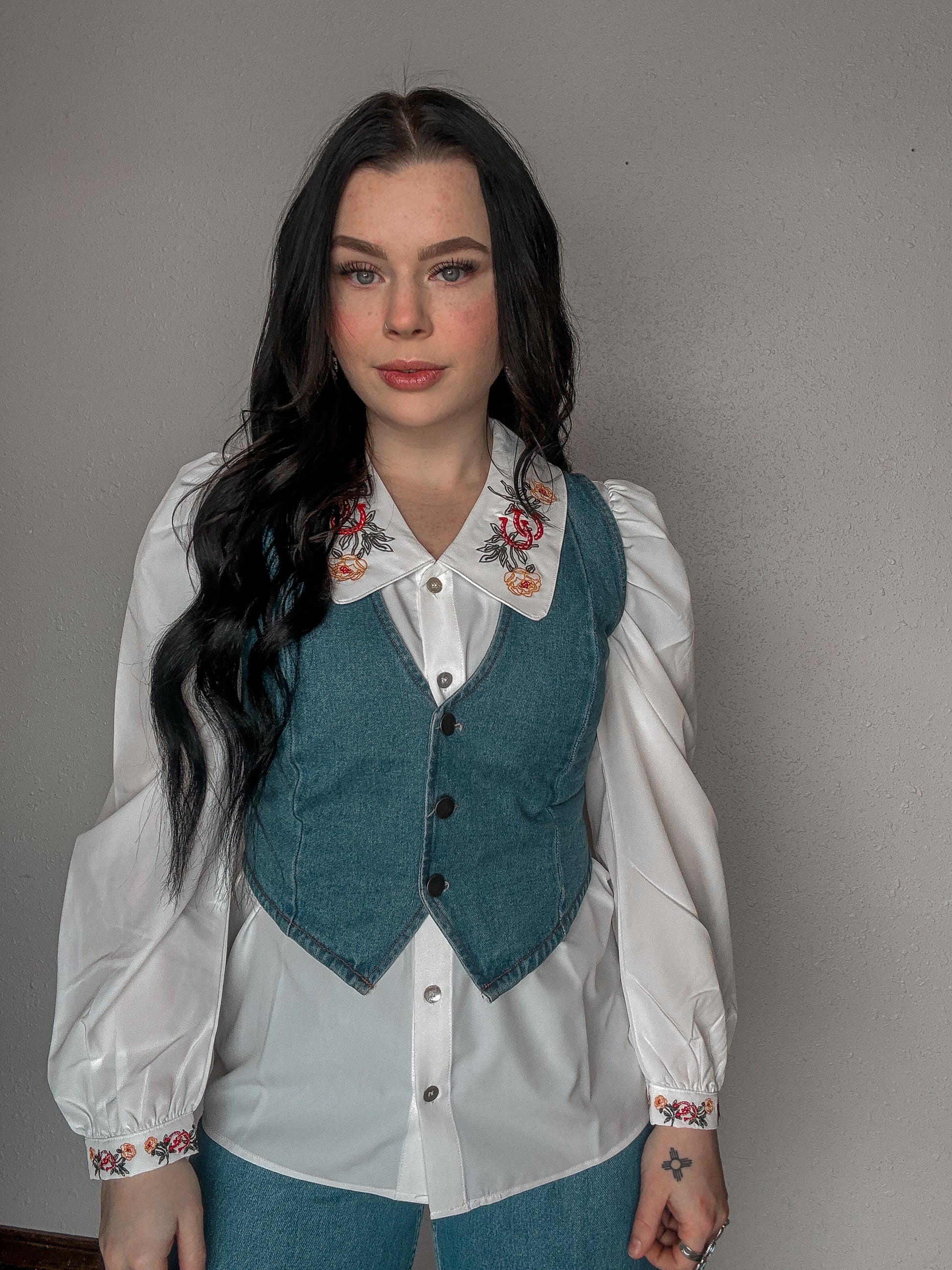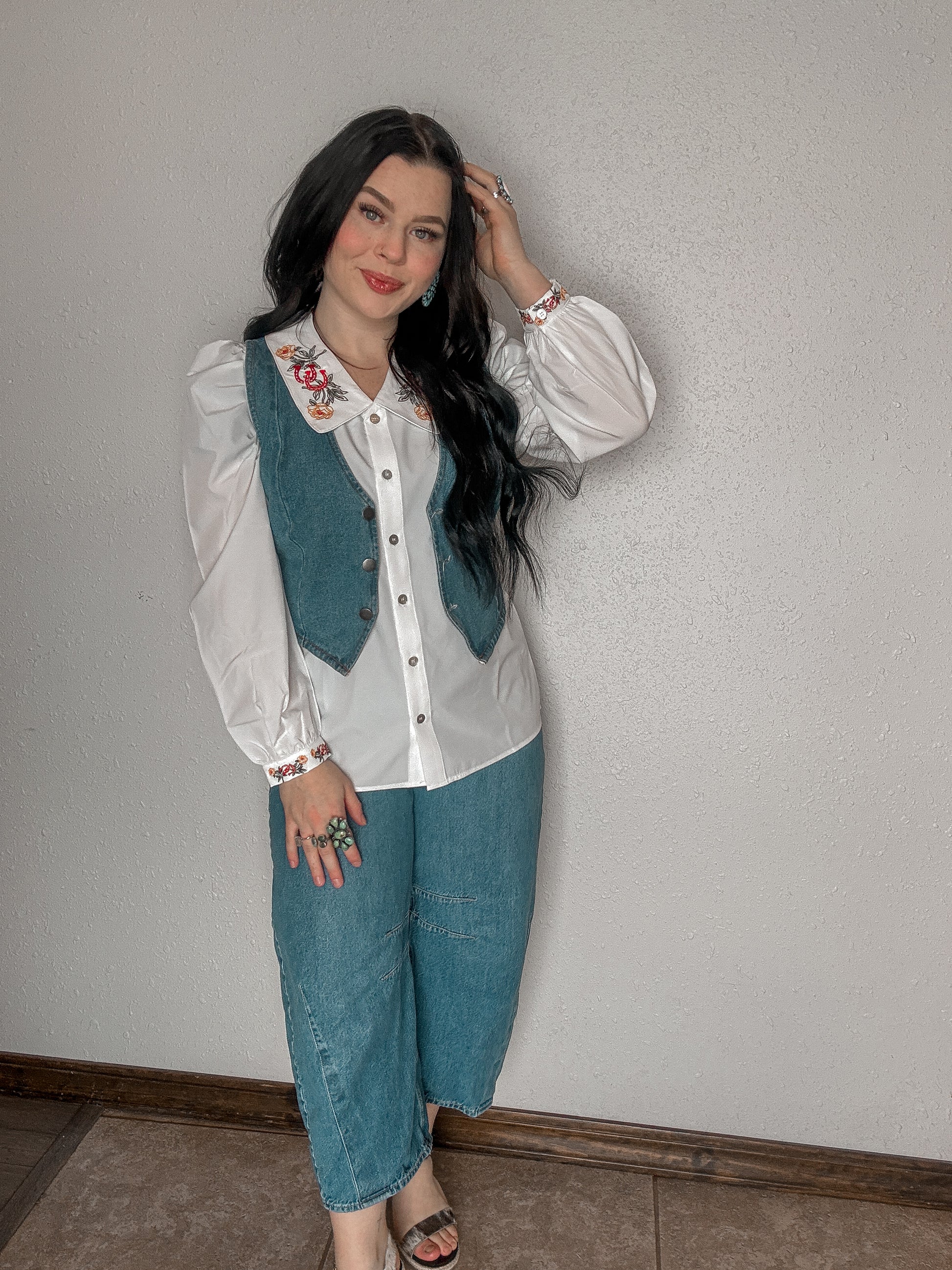 This ivory button-down blouse combines feminine detailing with subtle western flair. Featuring embroidered horseshoes and florals on a wide collar and cuffs, it offers a polished yet playful option for boutique collections.