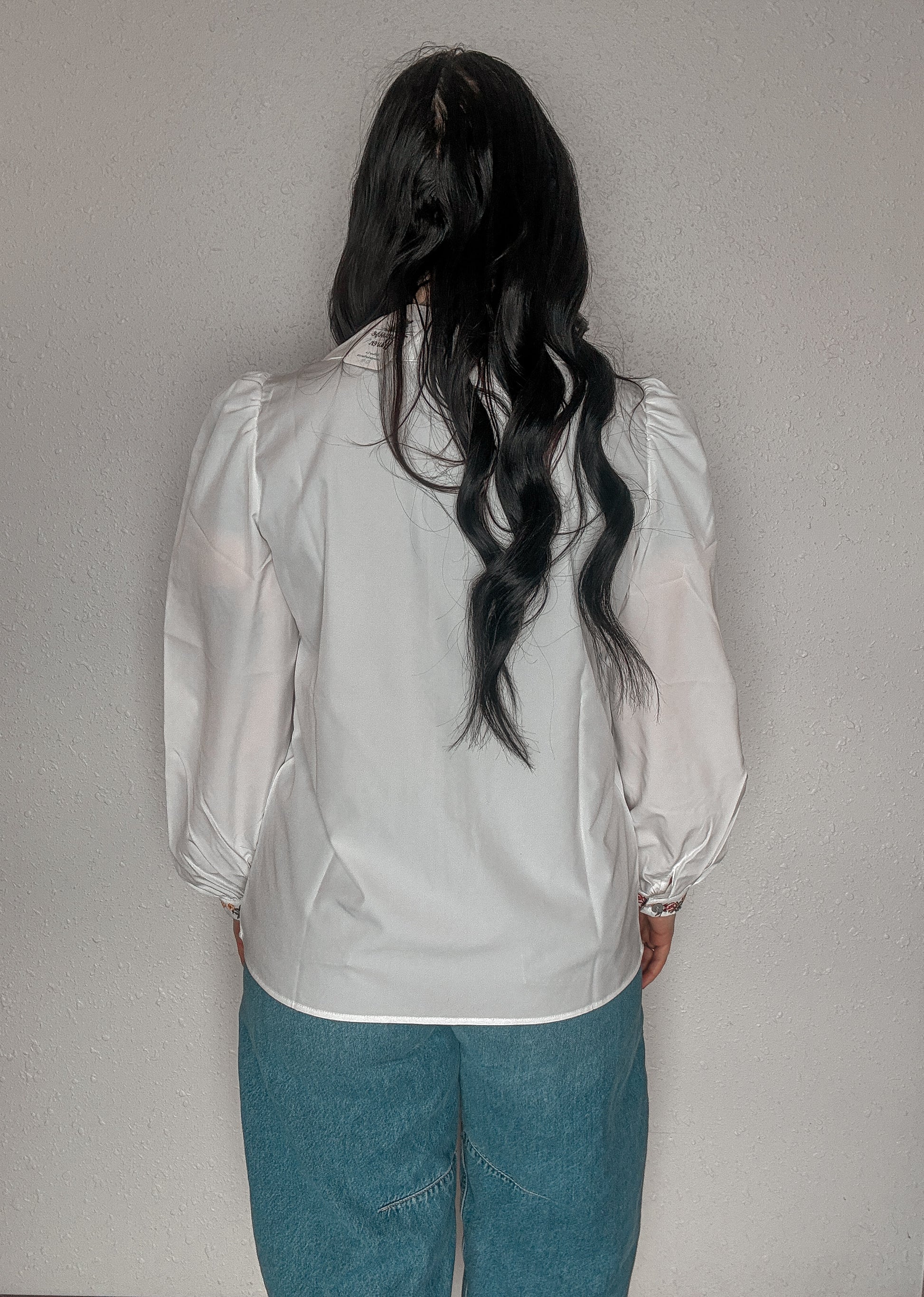 Sleeves: Long sleeves with slight puff at shoulder and buttoned cuff