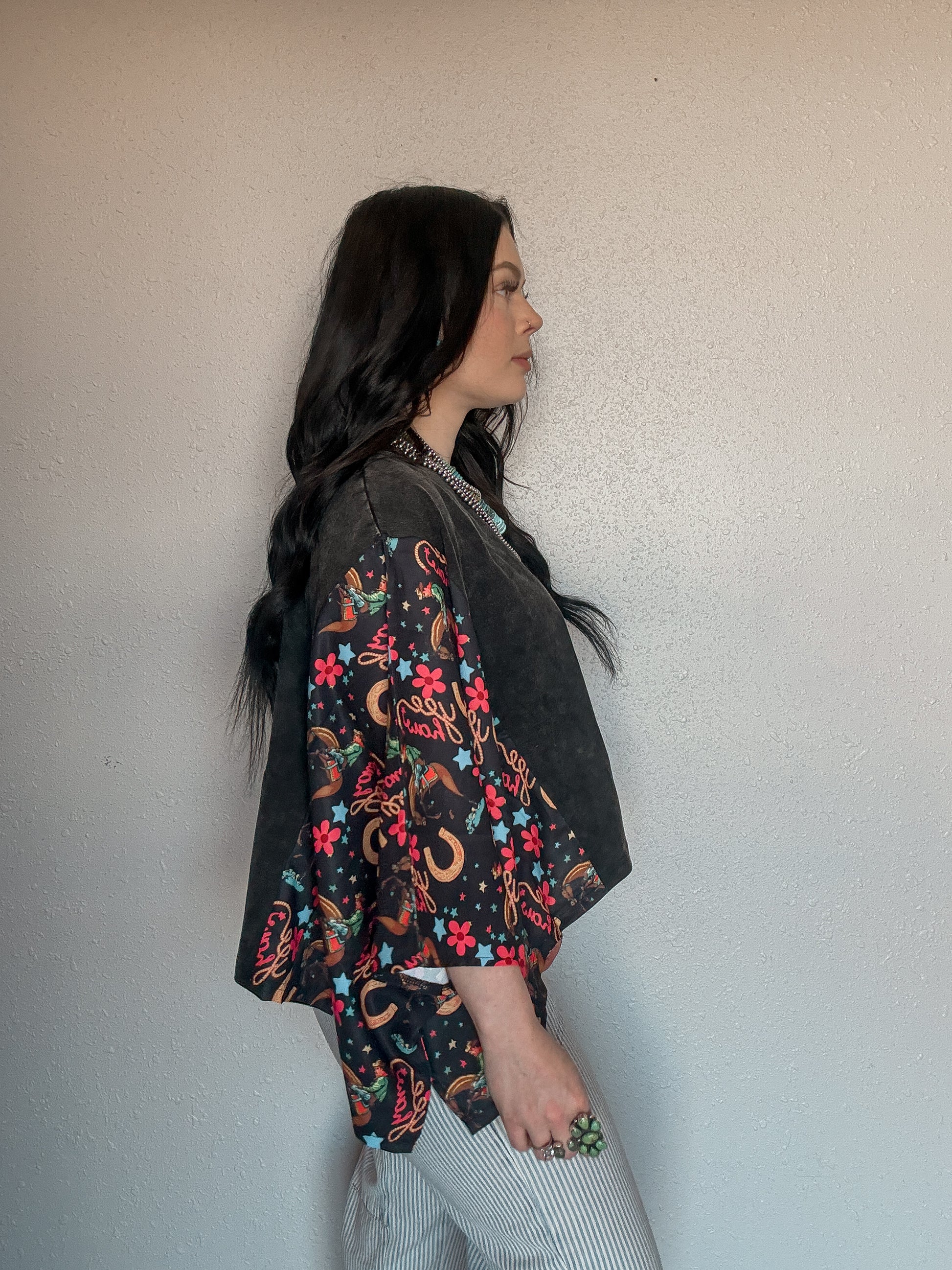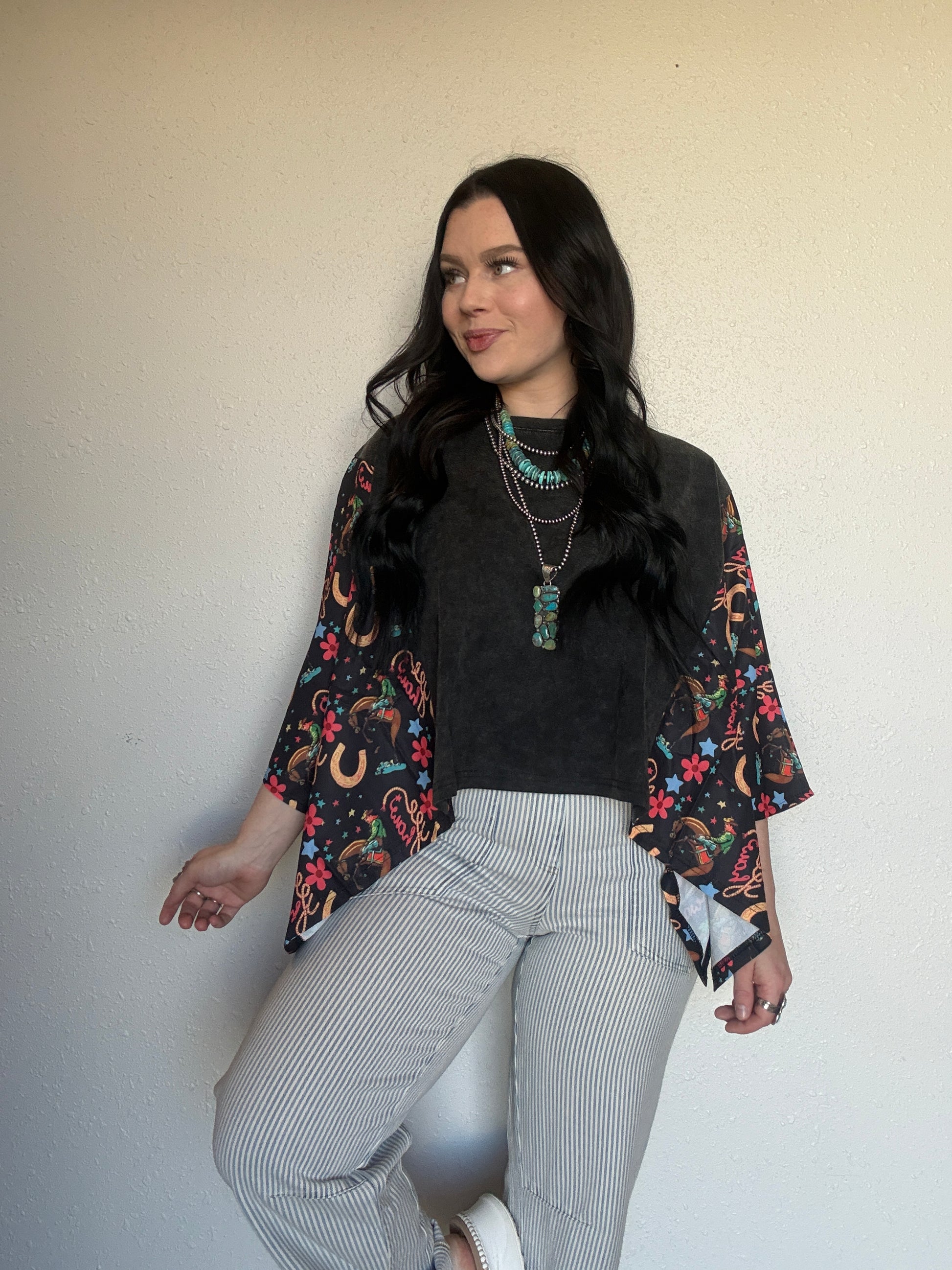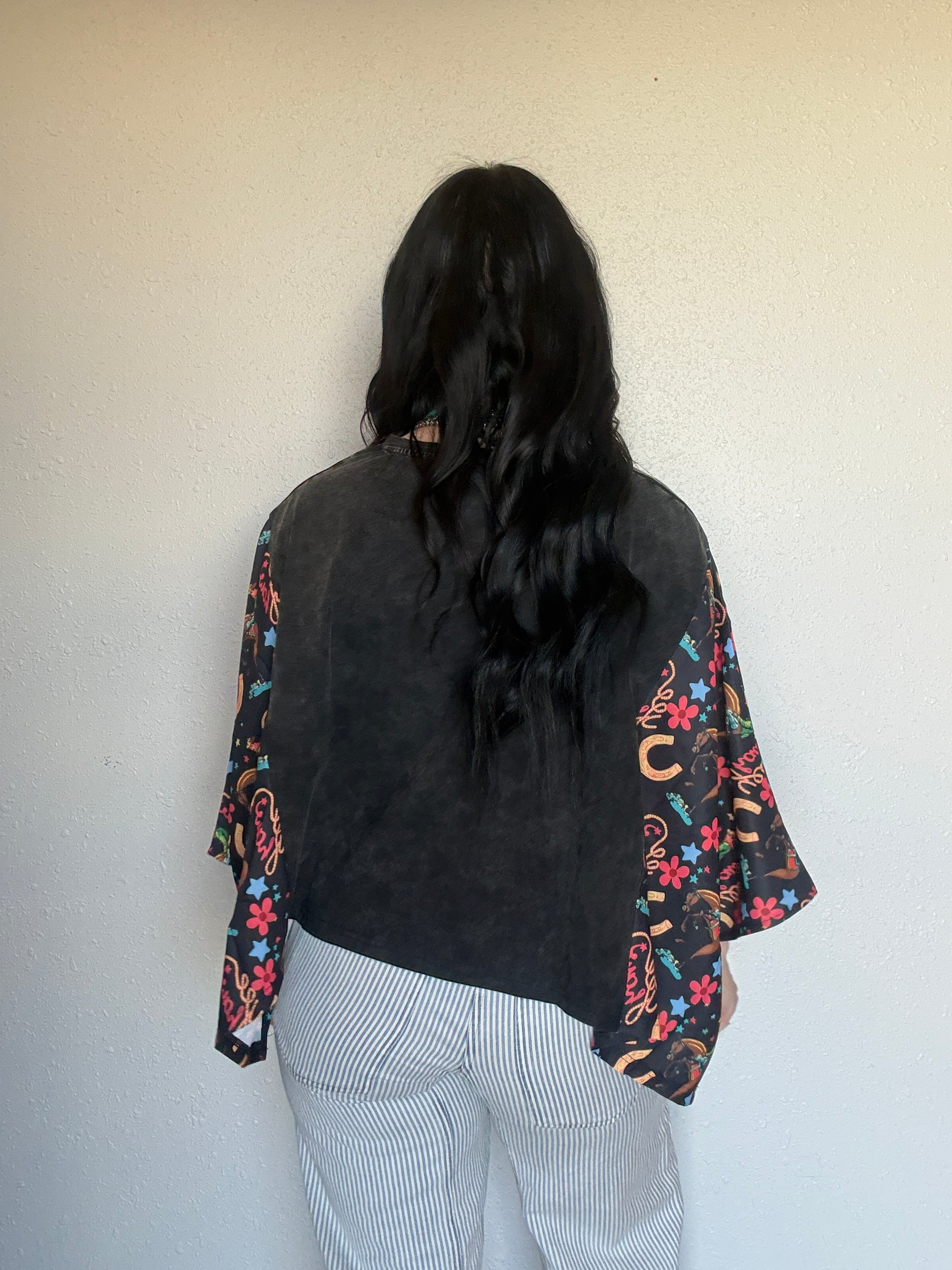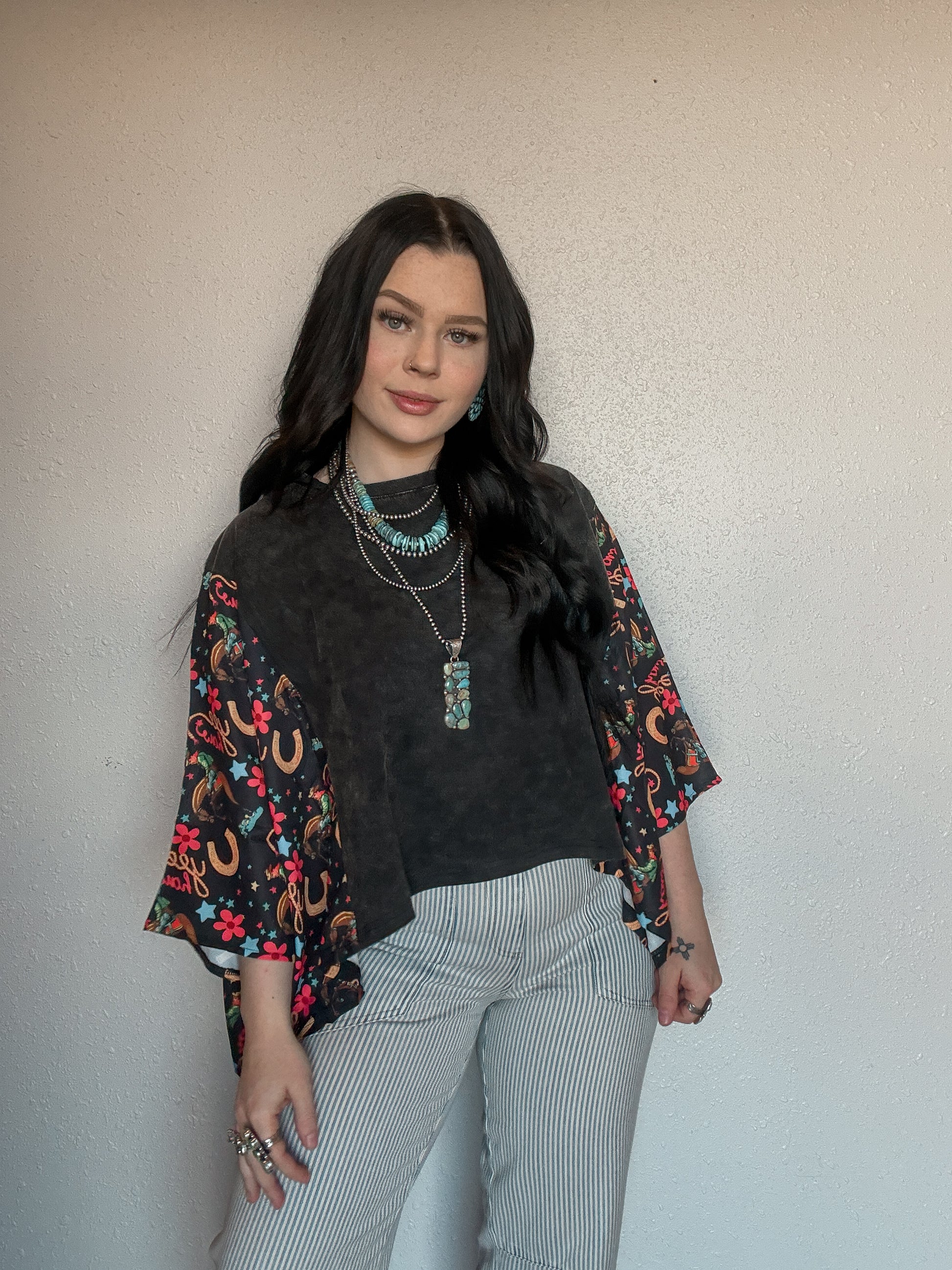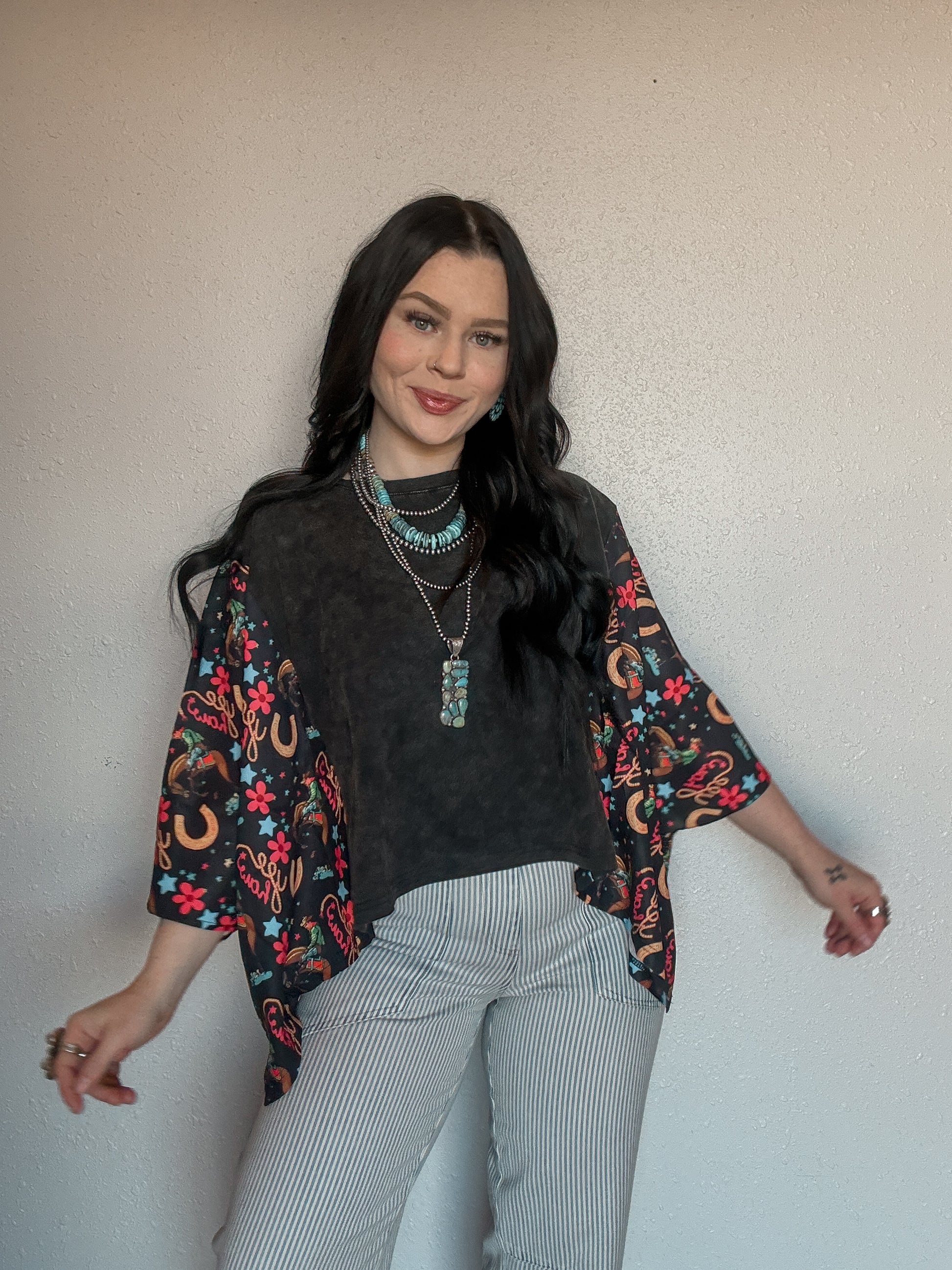 This oversized bubble sleeve tee is all about effortless style with a bold twist. Featuring a washed, lived-in body and eye-catching western print sleeves, it’s the perfect mix of casual and standout. The relaxed, oversized fit gives you that comfy, throw-on-and-go feel while the flowy bubble sleeves add just the right amount of drama.