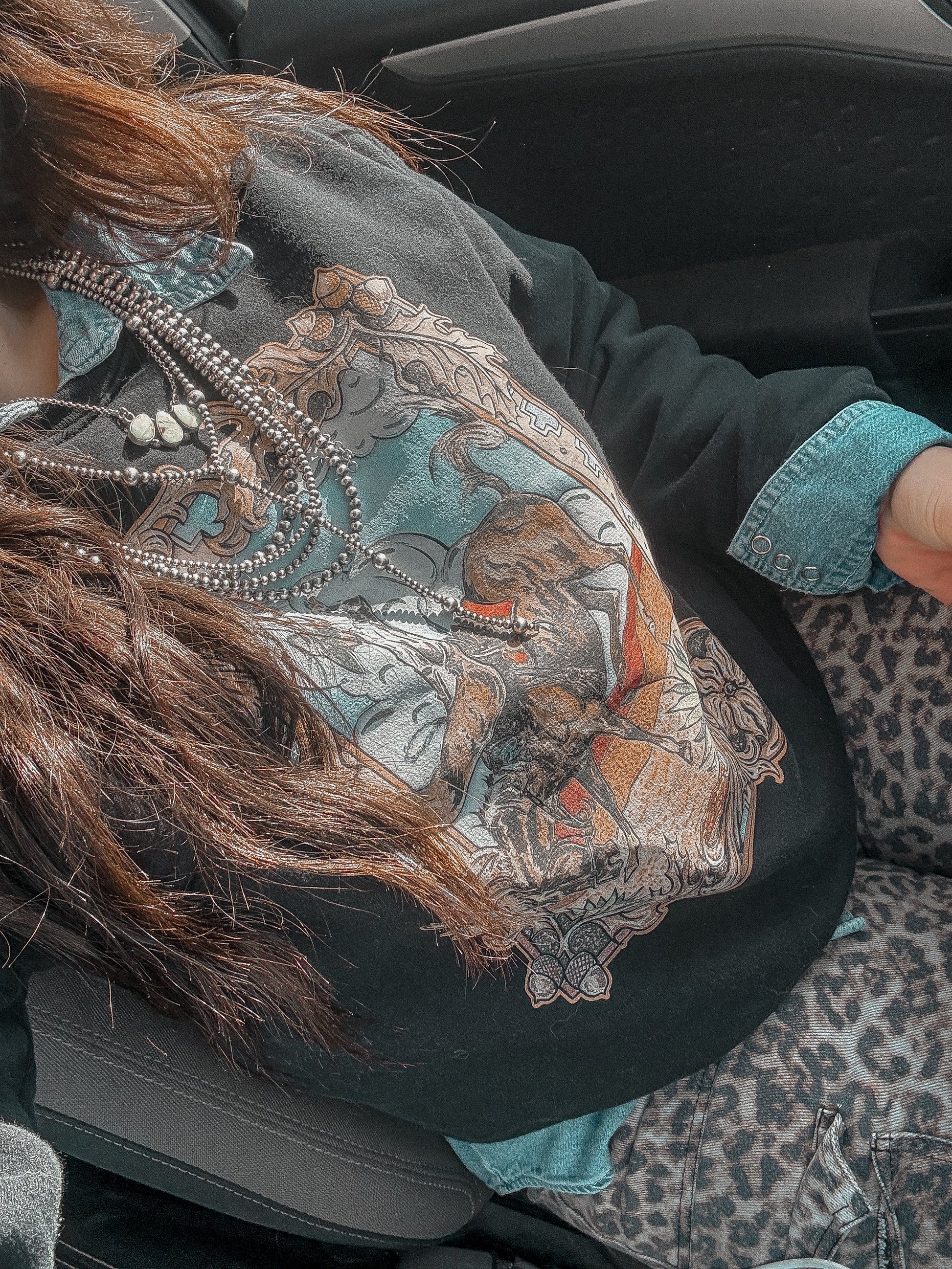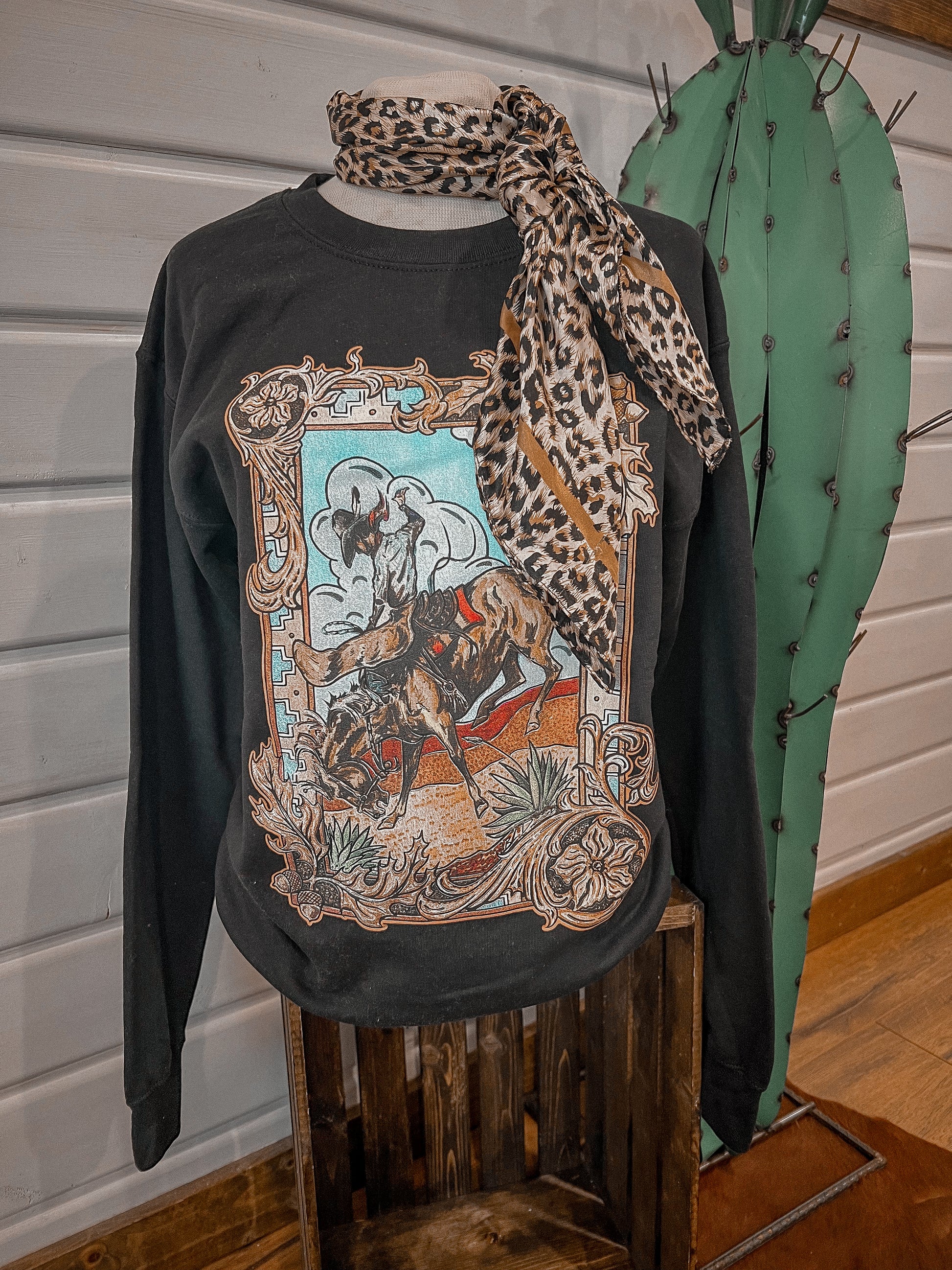 The Bronc by Blu is your perfect rodeo-ready ride! Keep warm and look wild with this black sweatshirt featuring a tooled boarder of a bucking bronc and a classic Western desert background. Yeehaw!