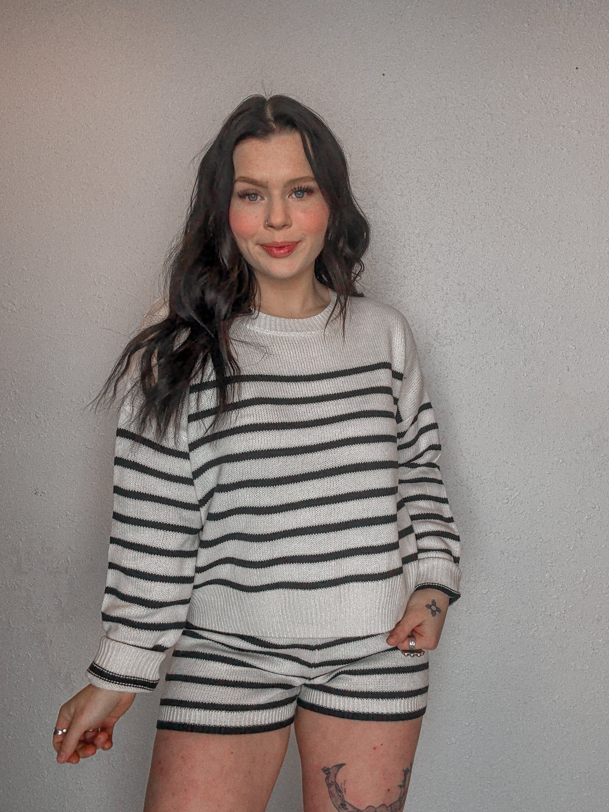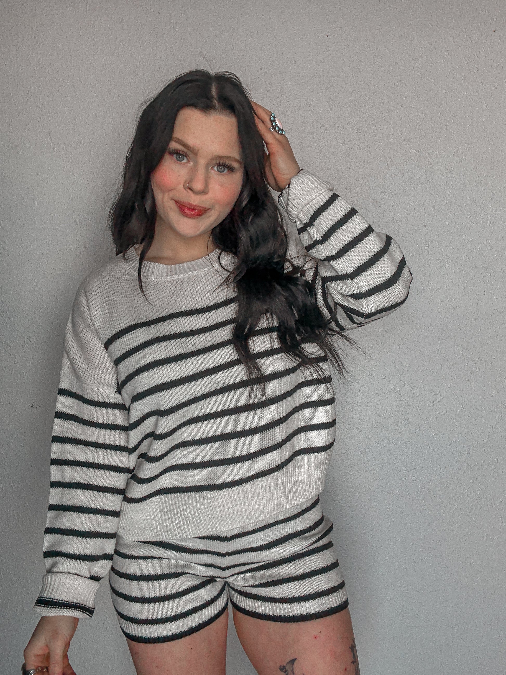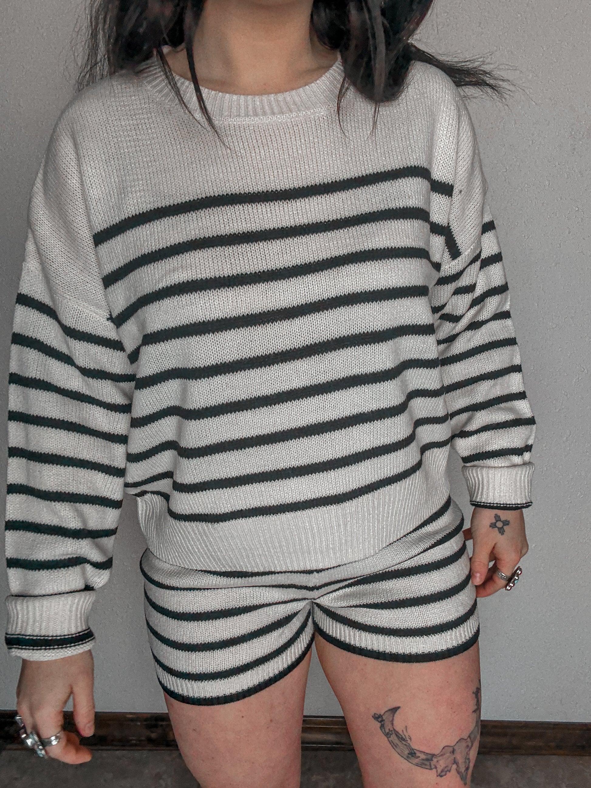 This coordinated set features a striped sweater and matching shorts, perfect for a transition from cool mornings to warm afternoons. The relaxed fit ensures comfort while maintaining a stylish silhouette. Ideal for casual outings or home lounging, pair with sneakers and a denim jacket for an effortlessly stylish look. Versatile and easy to layer, this set promises style and practicality for every season.