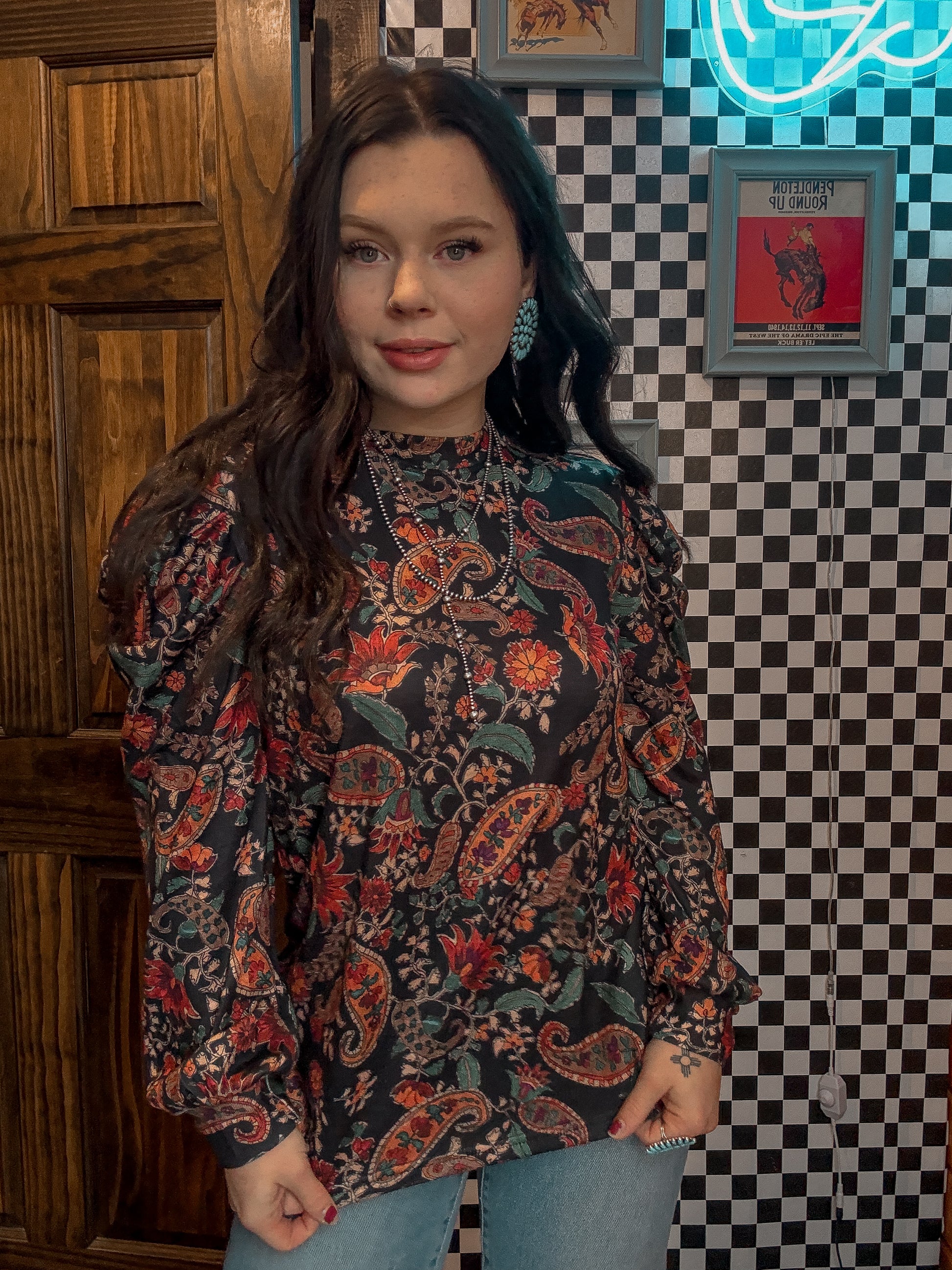 Bring a playful twist to your wardrobe with the Desert Rose Top. This black top features adorable bubble sleeves that add a fun, flirty vibe, while the perfect paisley pattern brings a pop of color and personality. Effortlessly stylish, it’s a charming choice for dressing up or keeping it casual with a hint of whimsy.