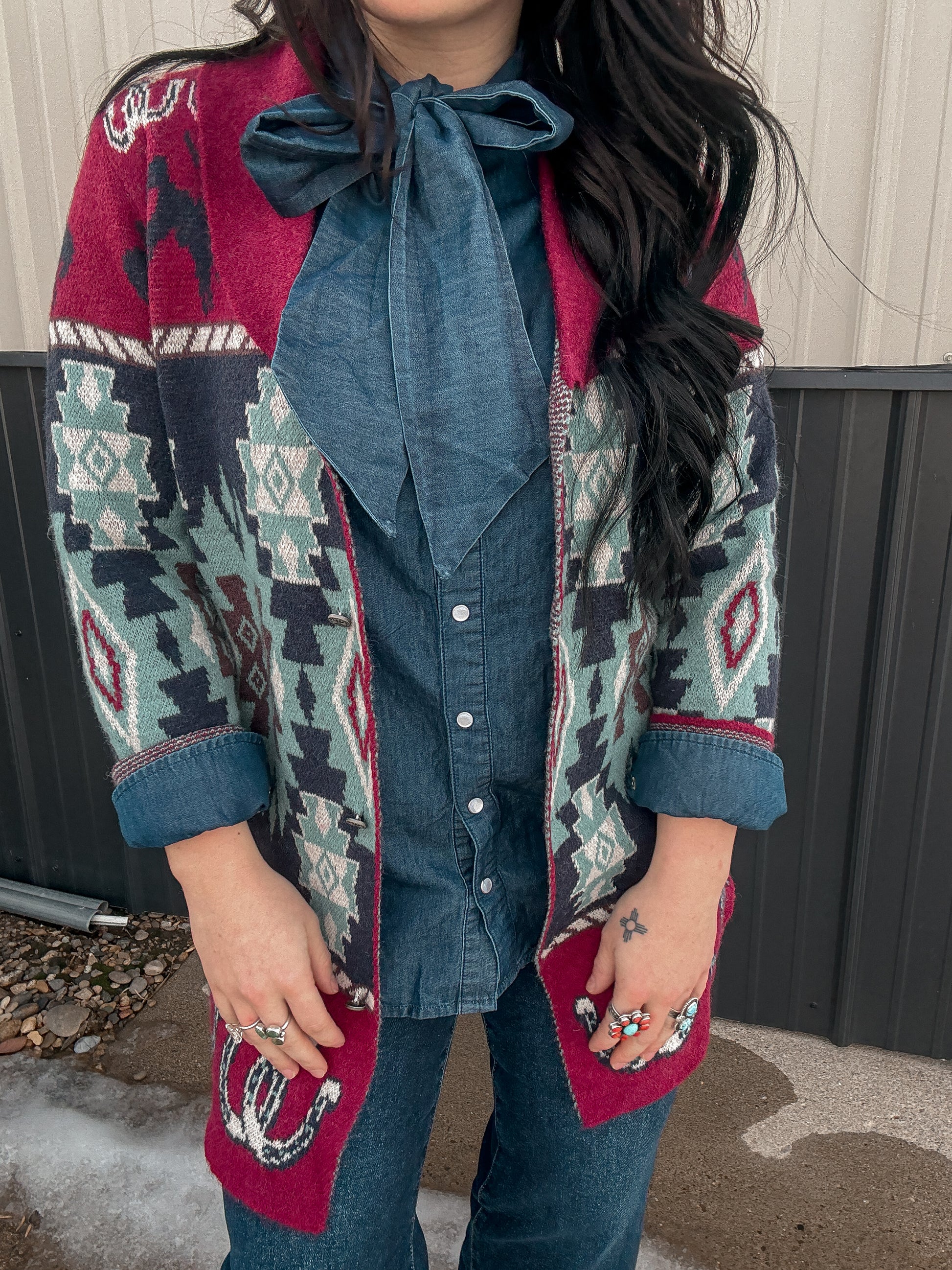 Make a bold statement with this Lucky & Blessed Western Aztec Knit Cardigan, where timeless comfort meets Western heritage. Designed in rich tones of burgundy, sage green, and navy, this long-sleeve knitwear features all-over Southwestern geometric patterns, cowboy silhouettes, and horseshoe motifsthat bring the spirit of the Wild West to life. The open-front silhouette drapes effortlessly over denim dresses or jeans. The hemline and shoulders are adorned with vivid red bands, highlighting detailed horseshoe graphics and bucking bronco motifs, creating a truly standout design. Crafted with comfort in mind, this cardigan is soft to the touch yet structured enough to elevate any casual Western outfit. Pair with boots and turquoise jewelry for an authentic ranchwear aesthetic